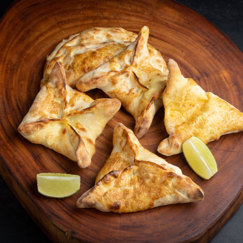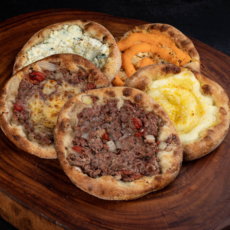 5 esfihas grandes fechadas de sabores variados entre carne e queijo