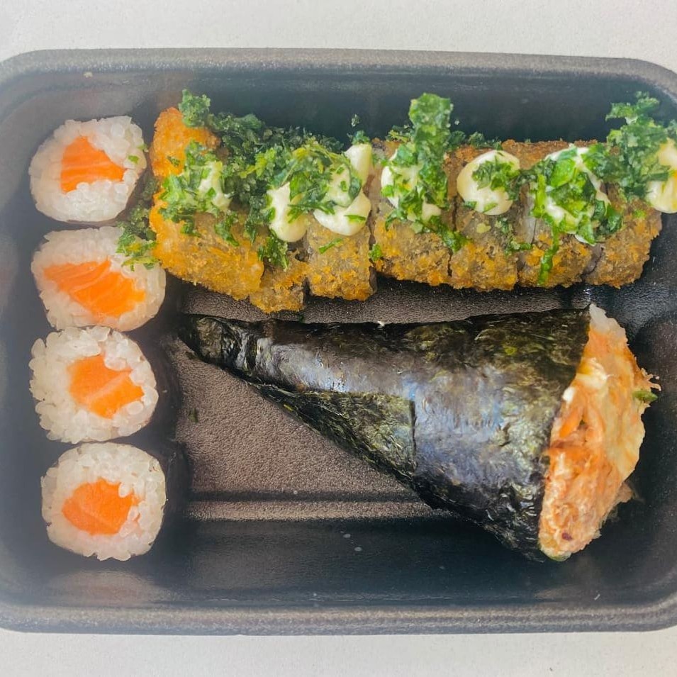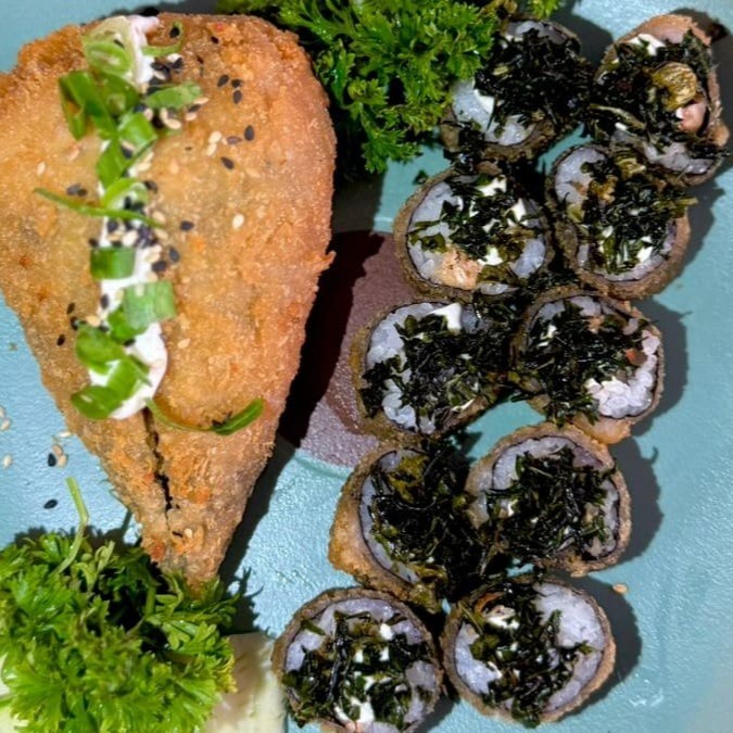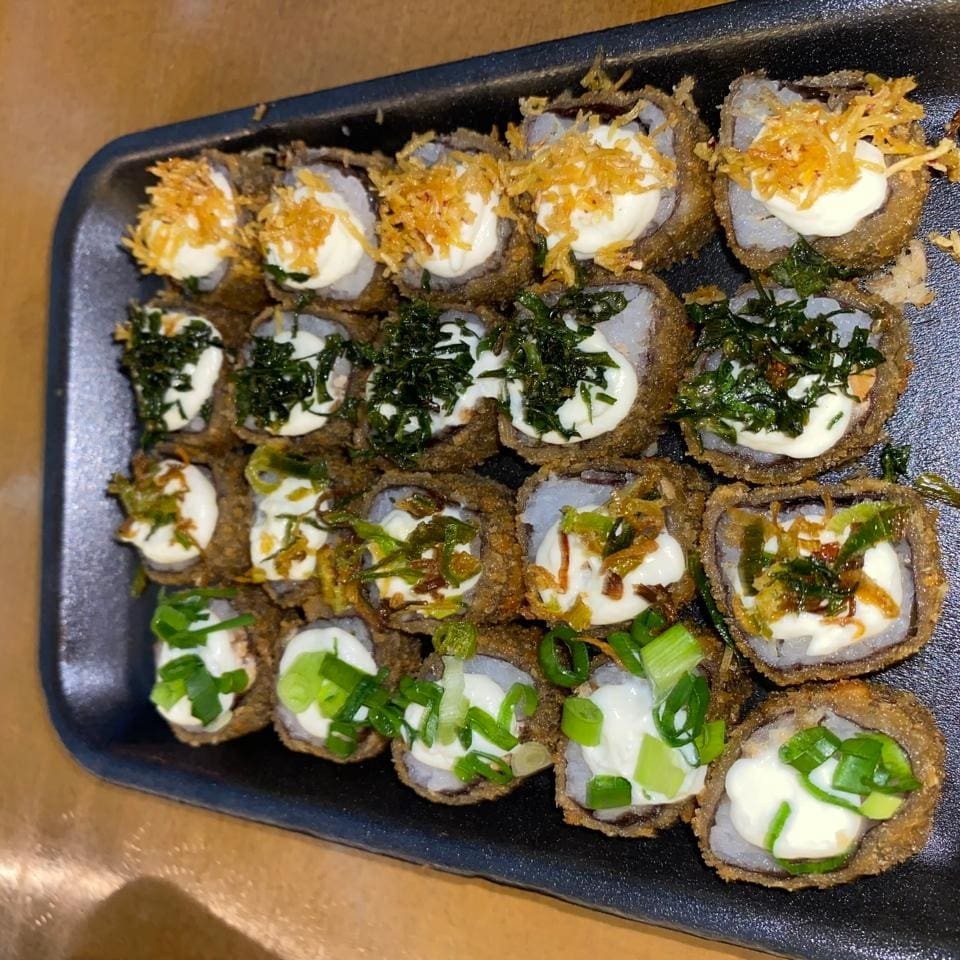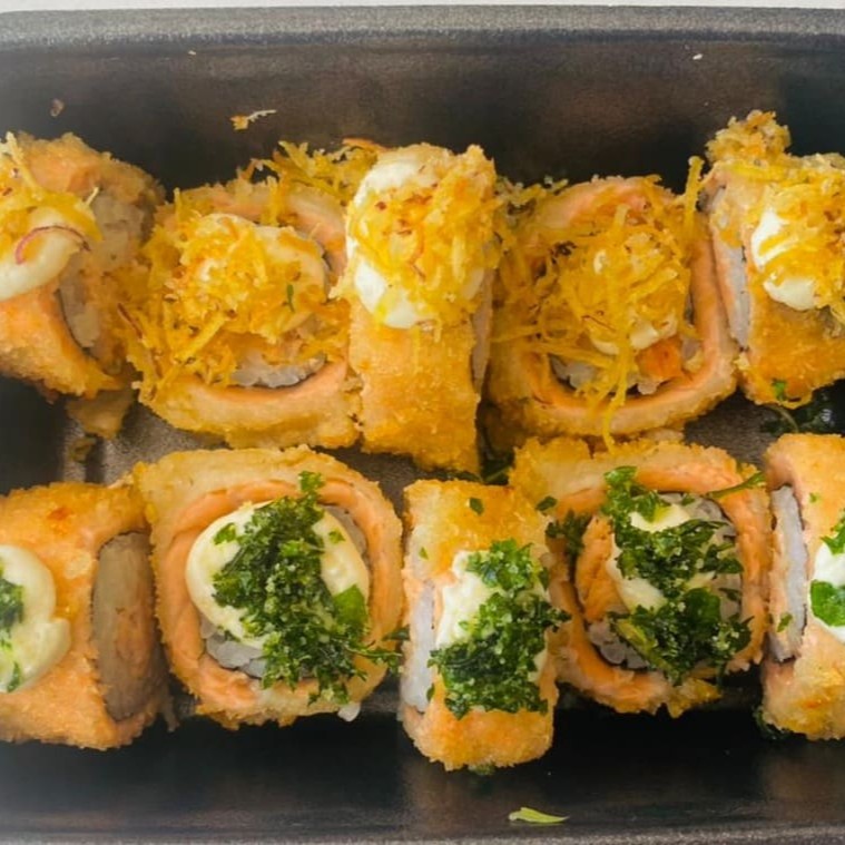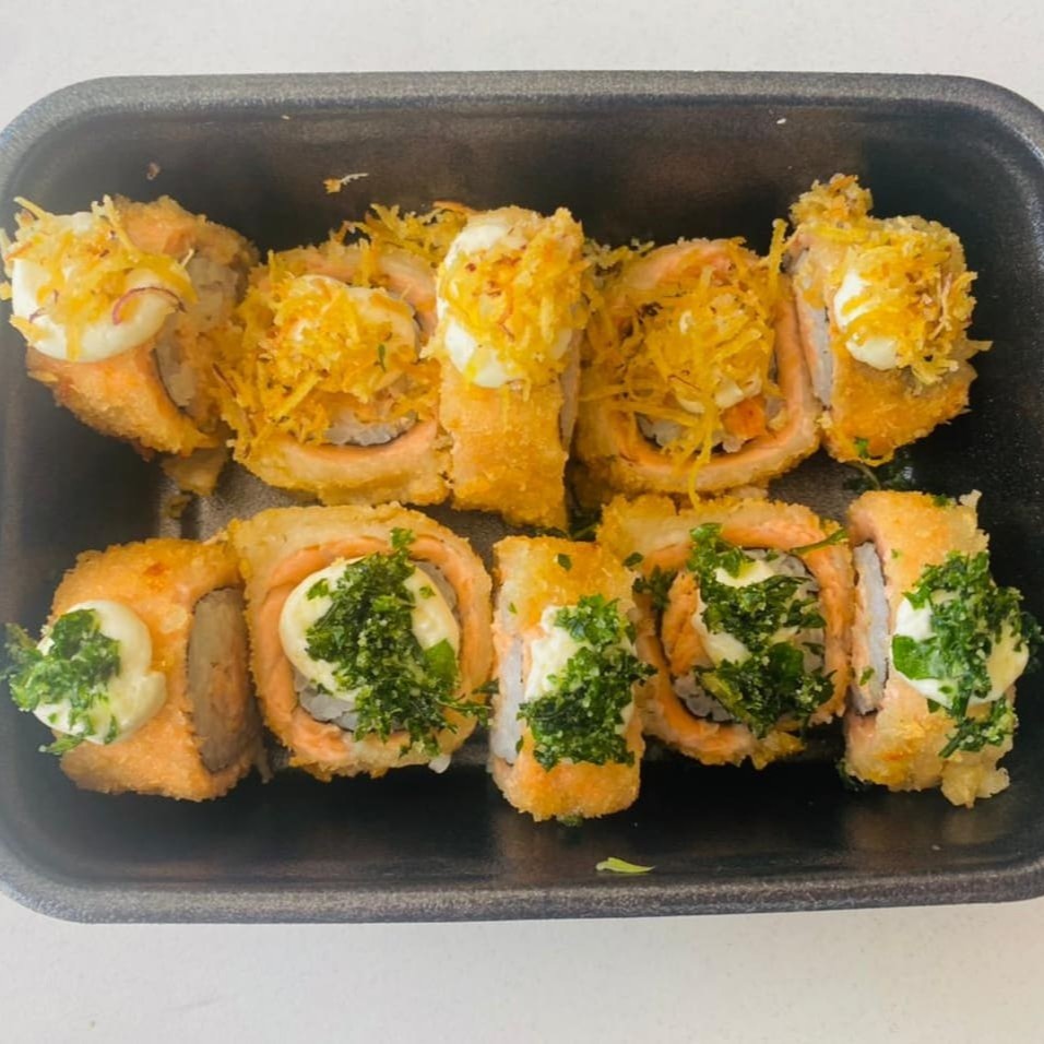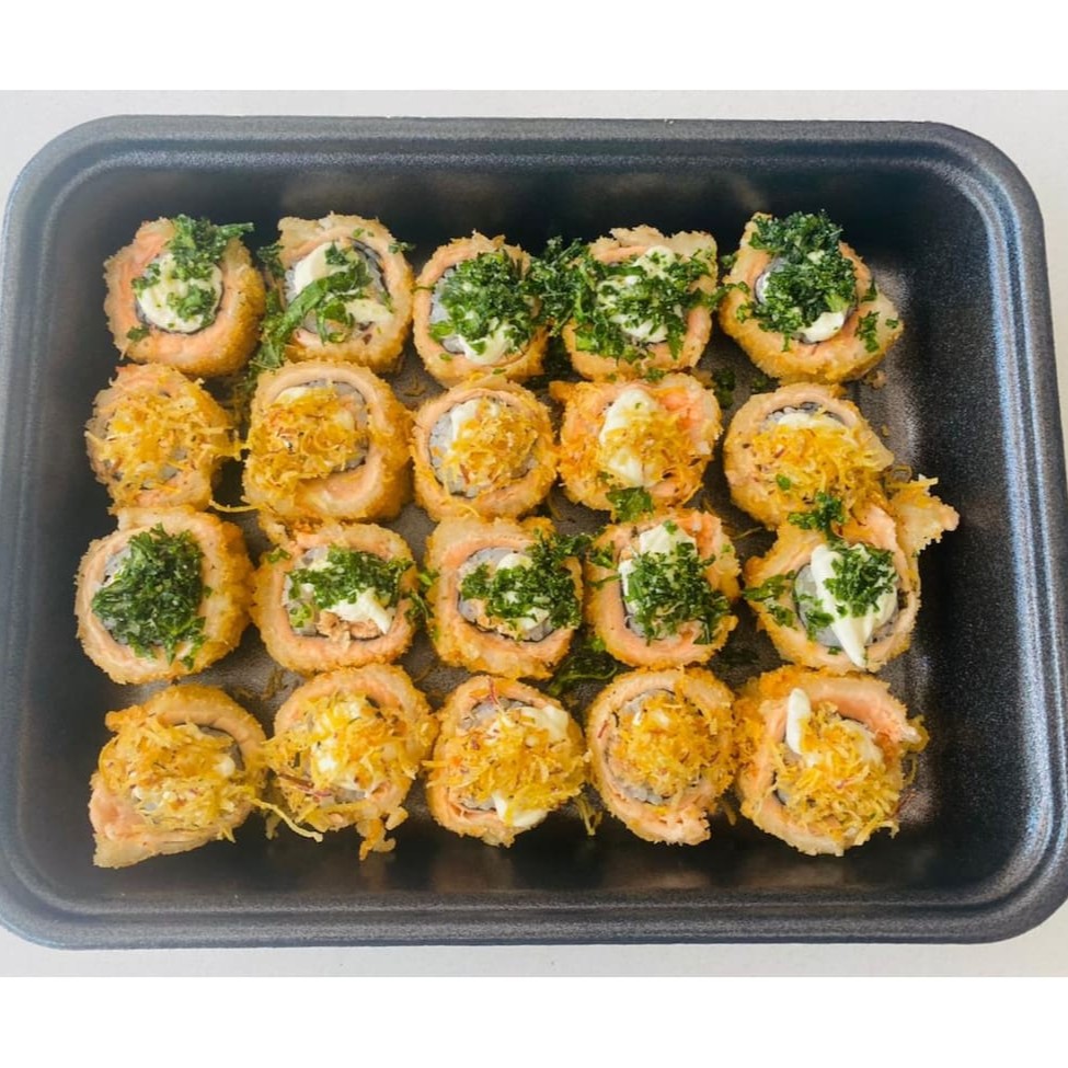 Maksushi frito. Acompanha 1 sachê tarê/ 1 sachê shoyo e 1 hashi. Caso queira á parte temos a opção de pedir.(Foto Ilustrativa)