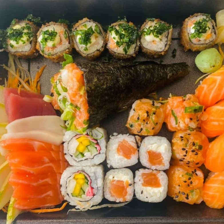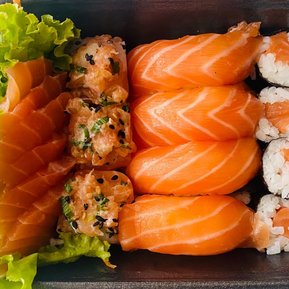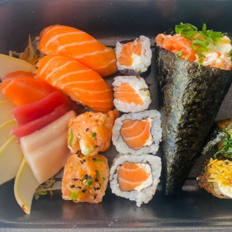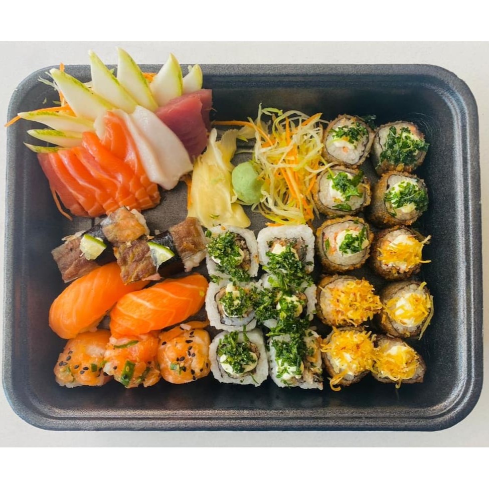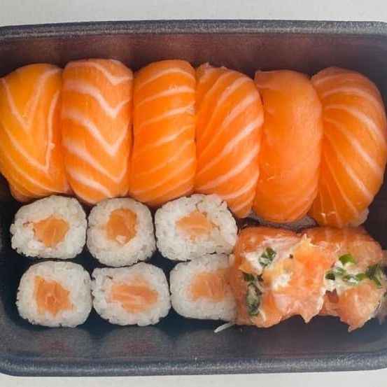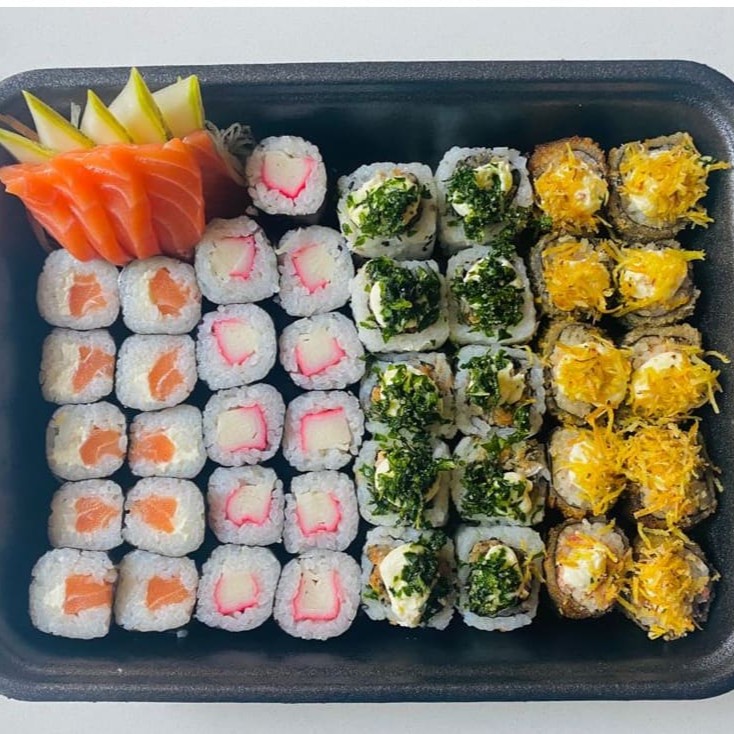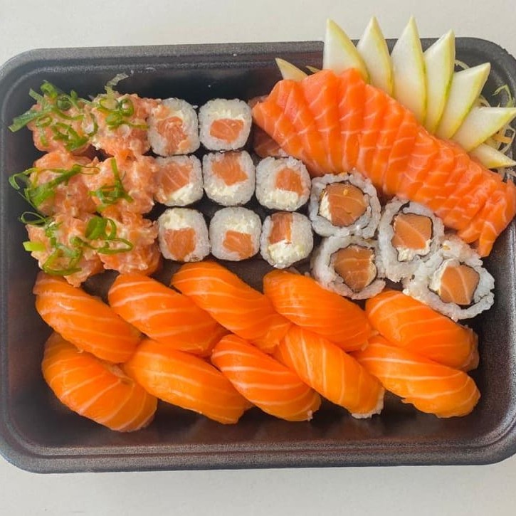 10 Uramaki Salmão 10 Niguiri Kanni 10 Hossomaki Pepino 10 Uramaki Califórnia Nao Trocamos Sushis . Acompanha 1 sachê tarê/ 1 sachê shoyo e 1 hashi. Caso queira á parte temos a opção de pedir.