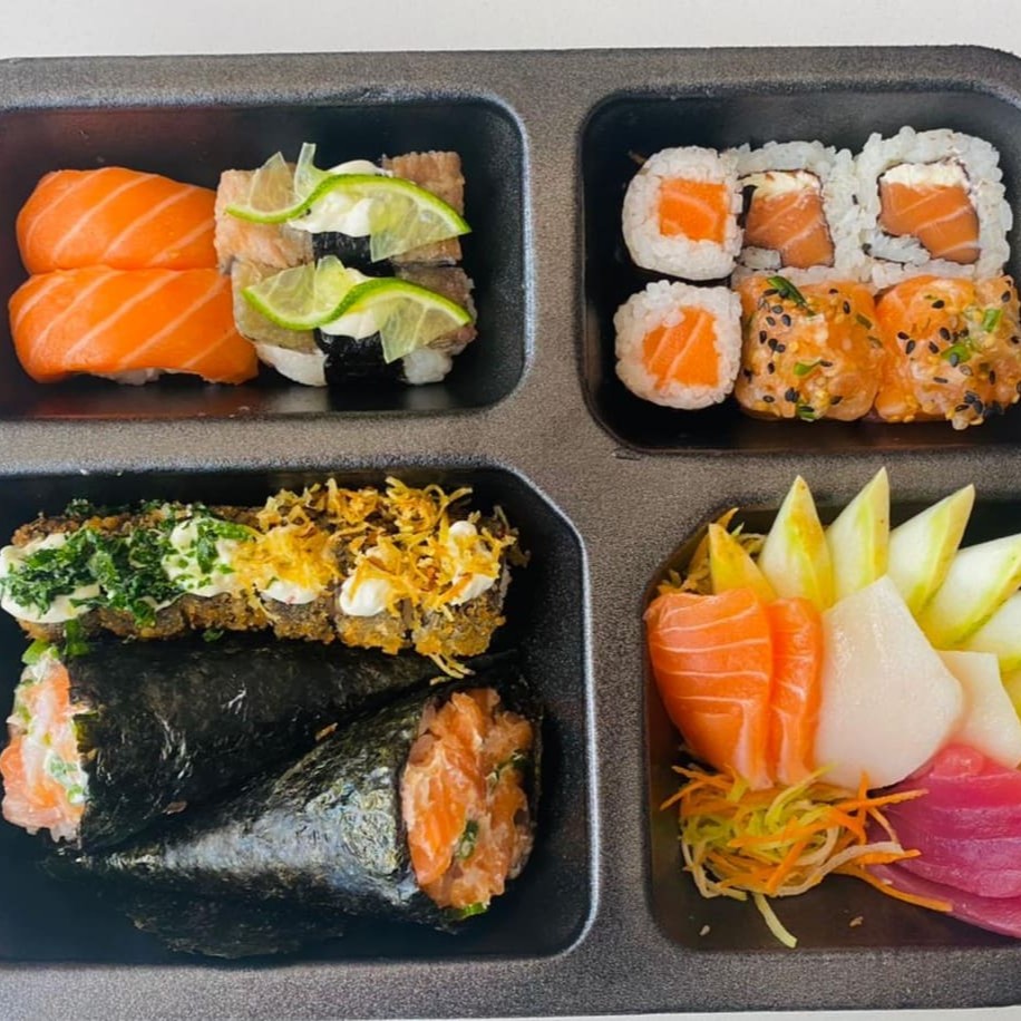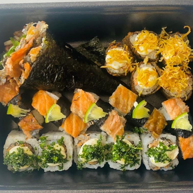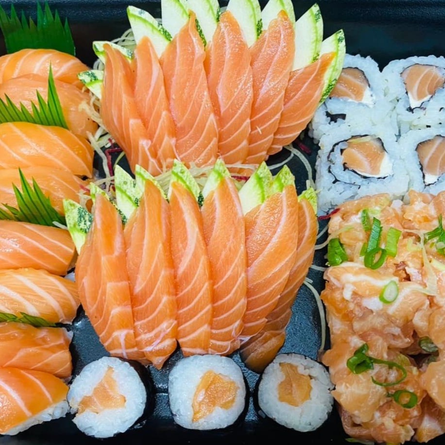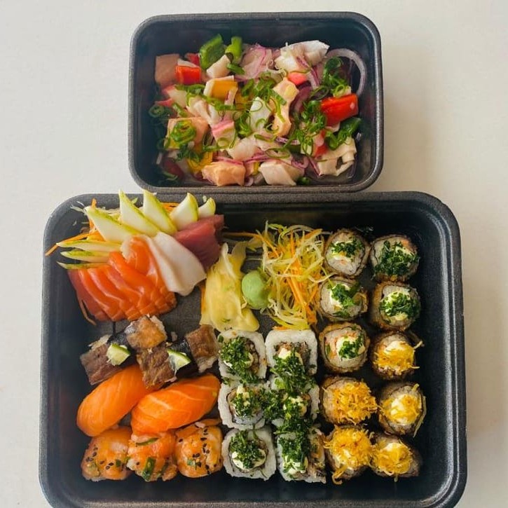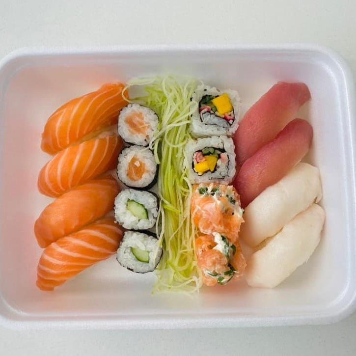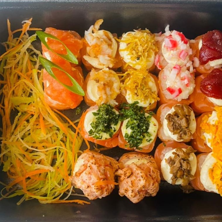 10 Uramaki Salmão 10 Niguiri Kanni 10 Hossomaki Pepino 10 Uramaki Califórnia Nao Trocamos Sushis . Acompanha 1 sachê tarê/ 1 sachê shoyo e 1 hashi. Caso queira á parte temos a opção de pedir.