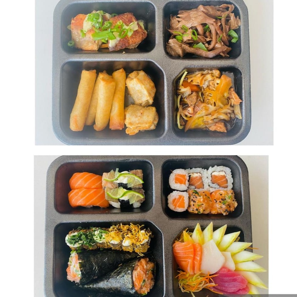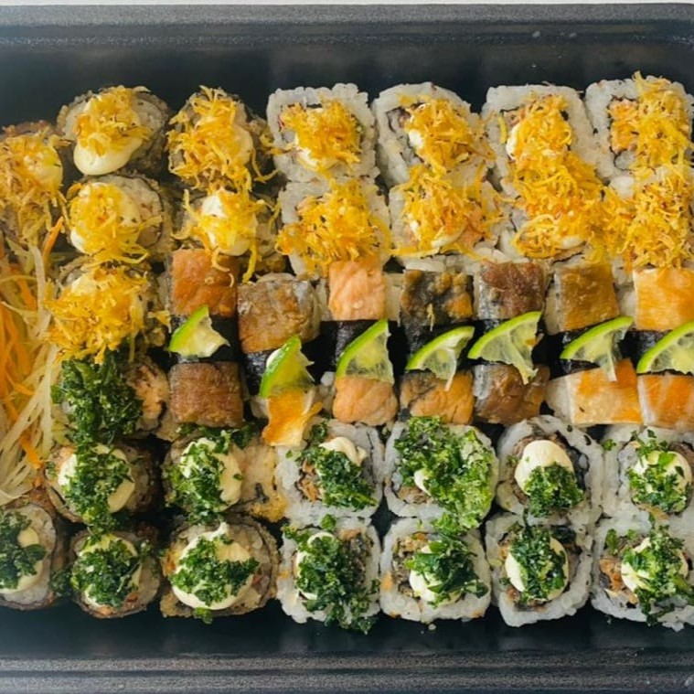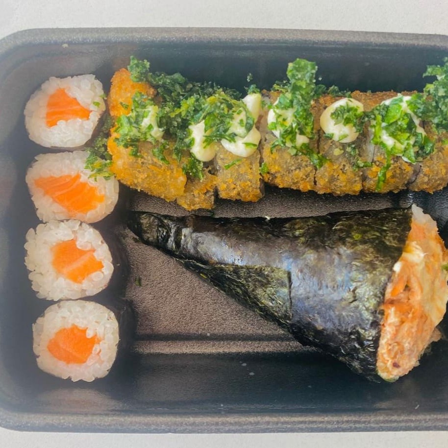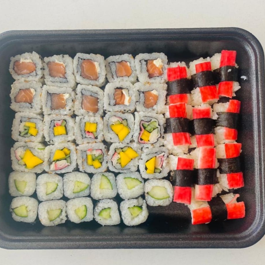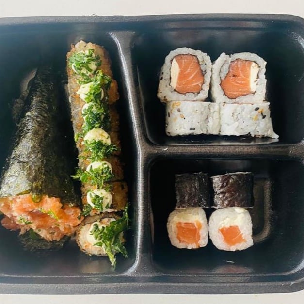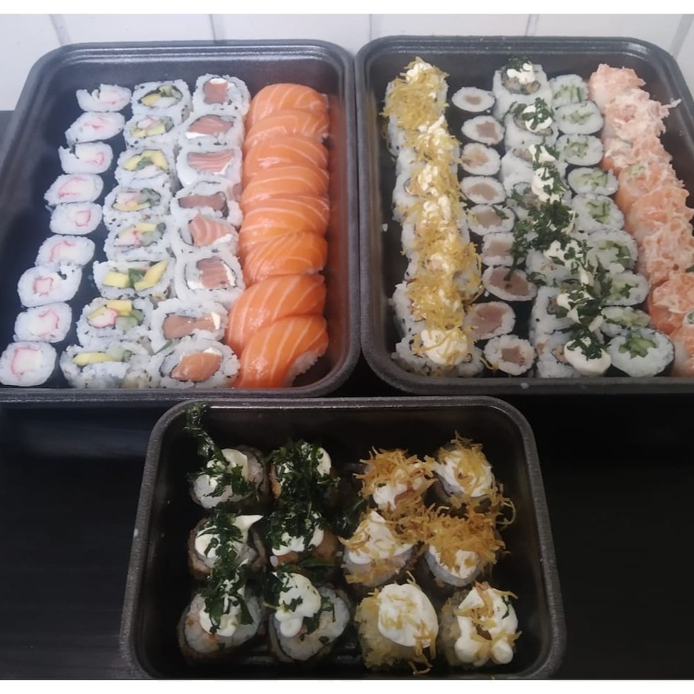10 Uramaki Salmão 10 Niguiri Kanni 10 Hossomaki Pepino 10 Uramaki Califórnia Nao Trocamos Sushis . Acompanha 1 sachê tarê/ 1 sachê shoyo e 1 hashi. Caso queira á parte temos a opção de pedir.