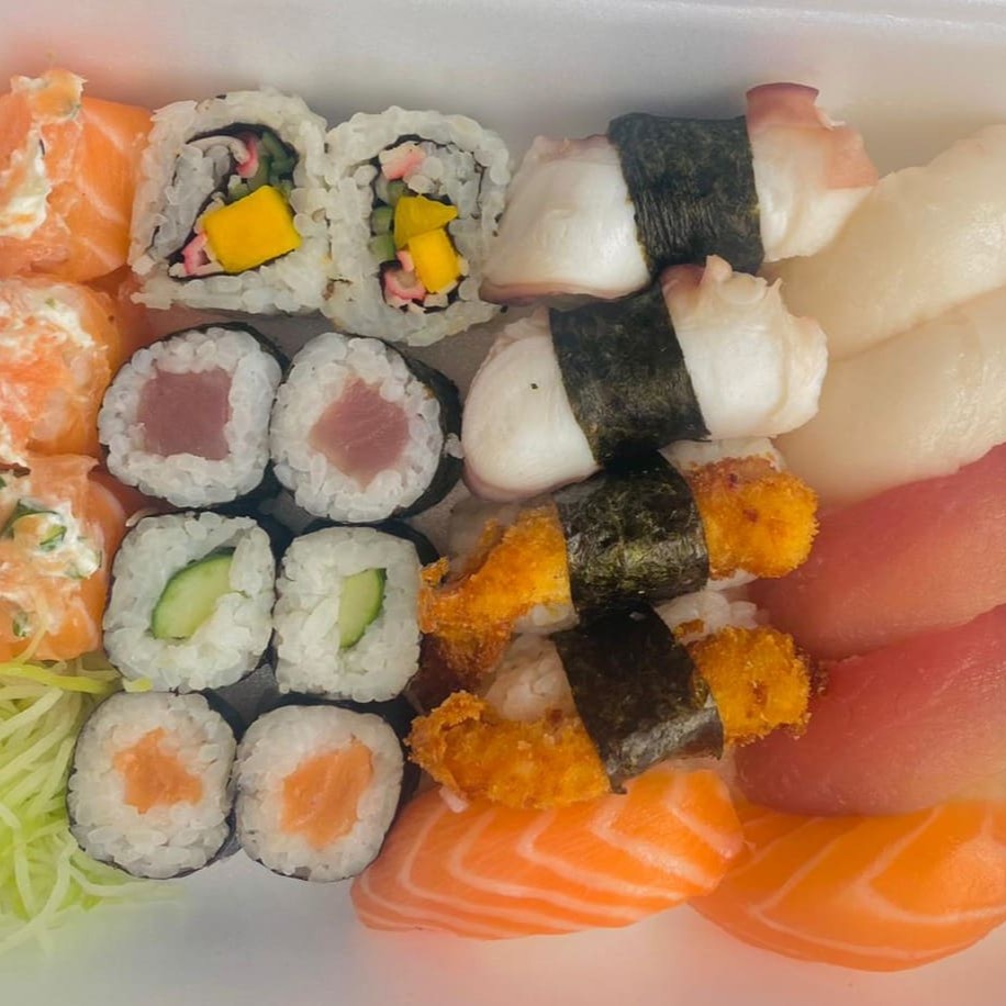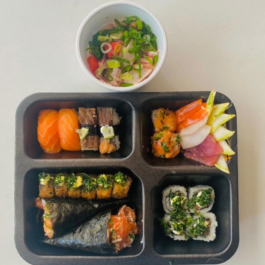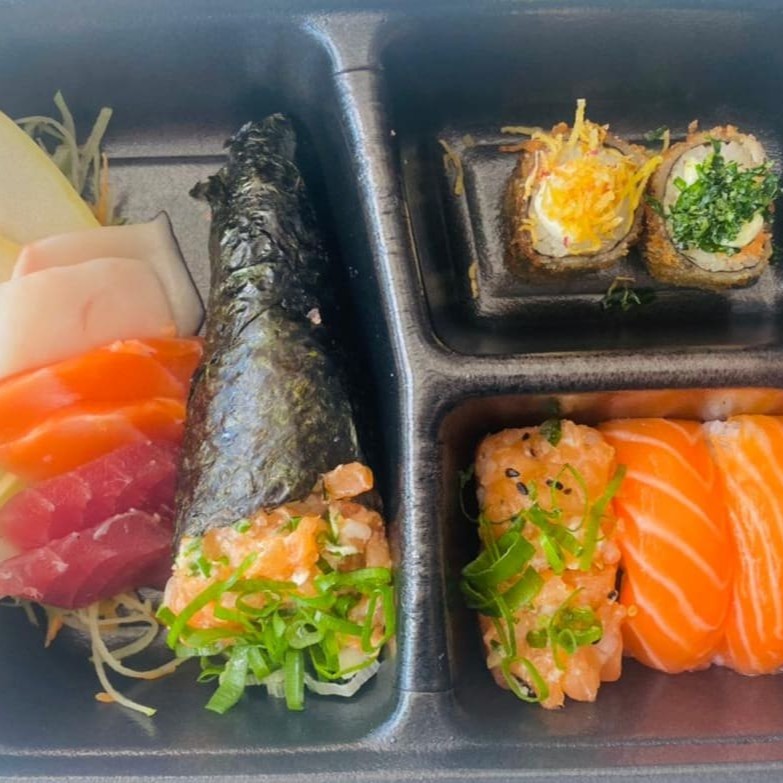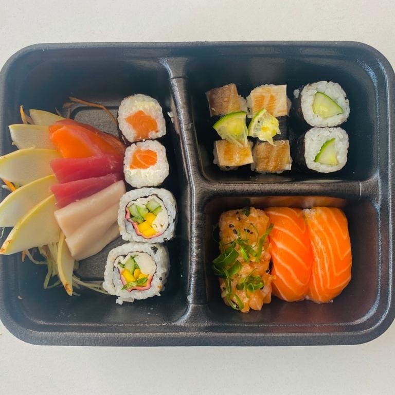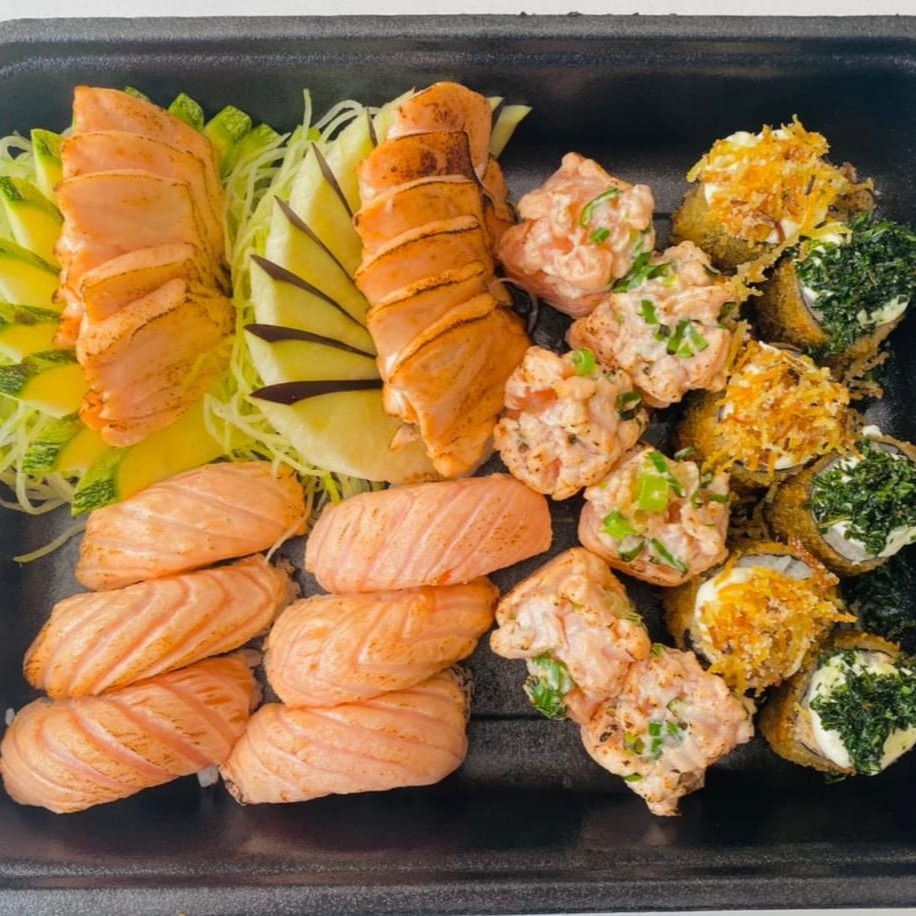 (10 sushis, 3 jhous, 2 tekaas, 2 kappas, 2 uramakis california e 2 salmonmakis) Acompanha 1 sachê tarê/ 1 sachê shoyo e 1 hashi. Caso queira á parte temos a opção de pedir.