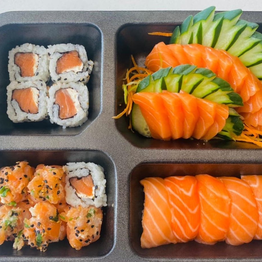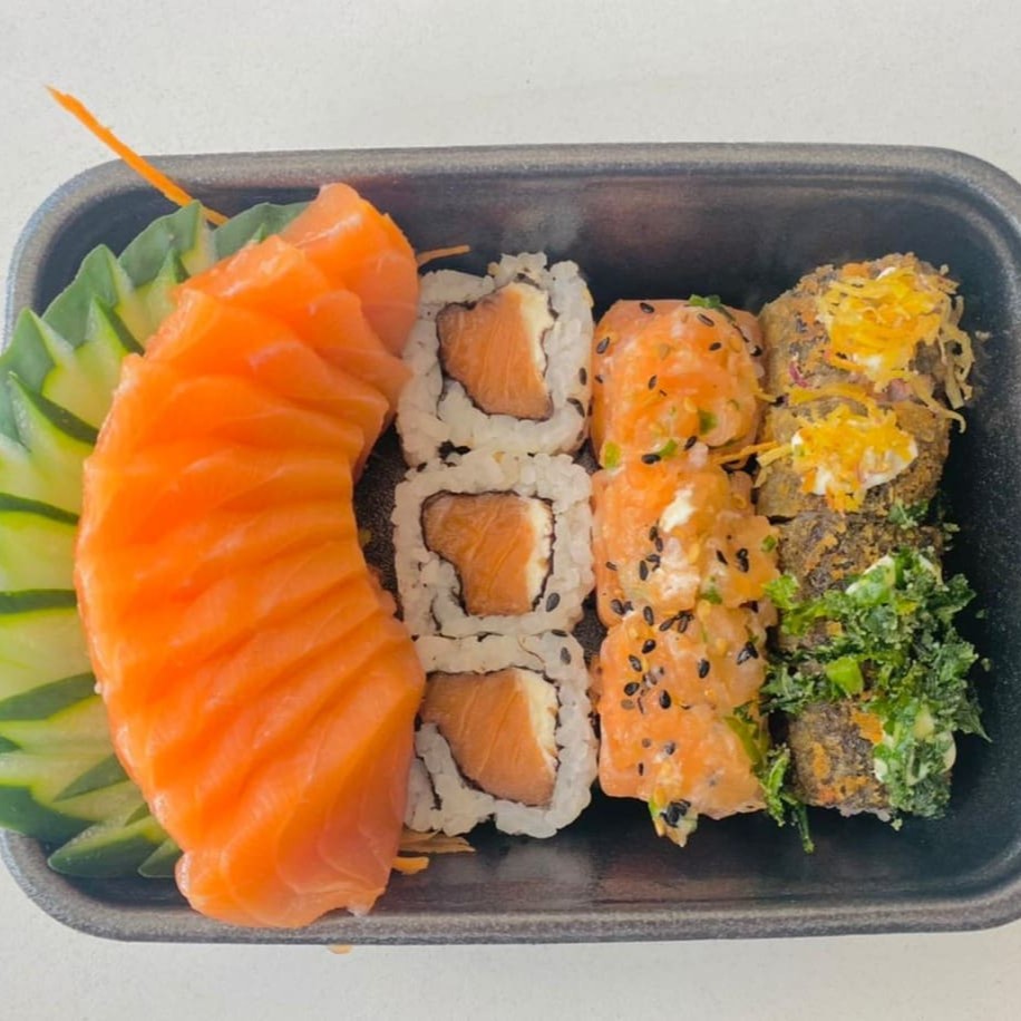 12 Sashimis 8 Sushis 4 Uramaki Salmão 4 Salmonmakis 6 jhous. Acompanha 1 sachê tarê/ 1 sachê shoyo e 1 hashi. Caso queira á parte temos a opção de pedir.