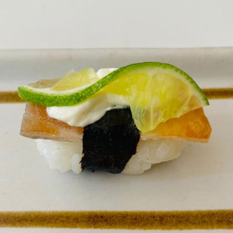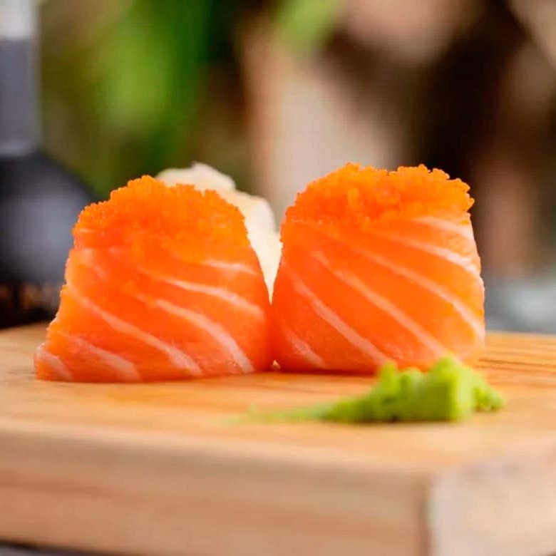 Sushi De Salmao Massaricado Acompanha 1 sachê tarê/ 1 sachê shoyo e 1 hashi. Caso queira á parte temos a opção de pedir.