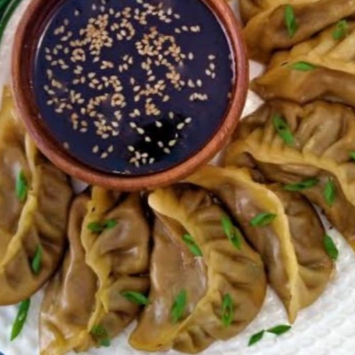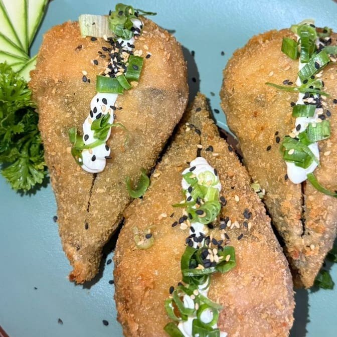 Enrolado vegetariano empanado recheado com shimeji, cream cheese, cebolinha e molho tare.