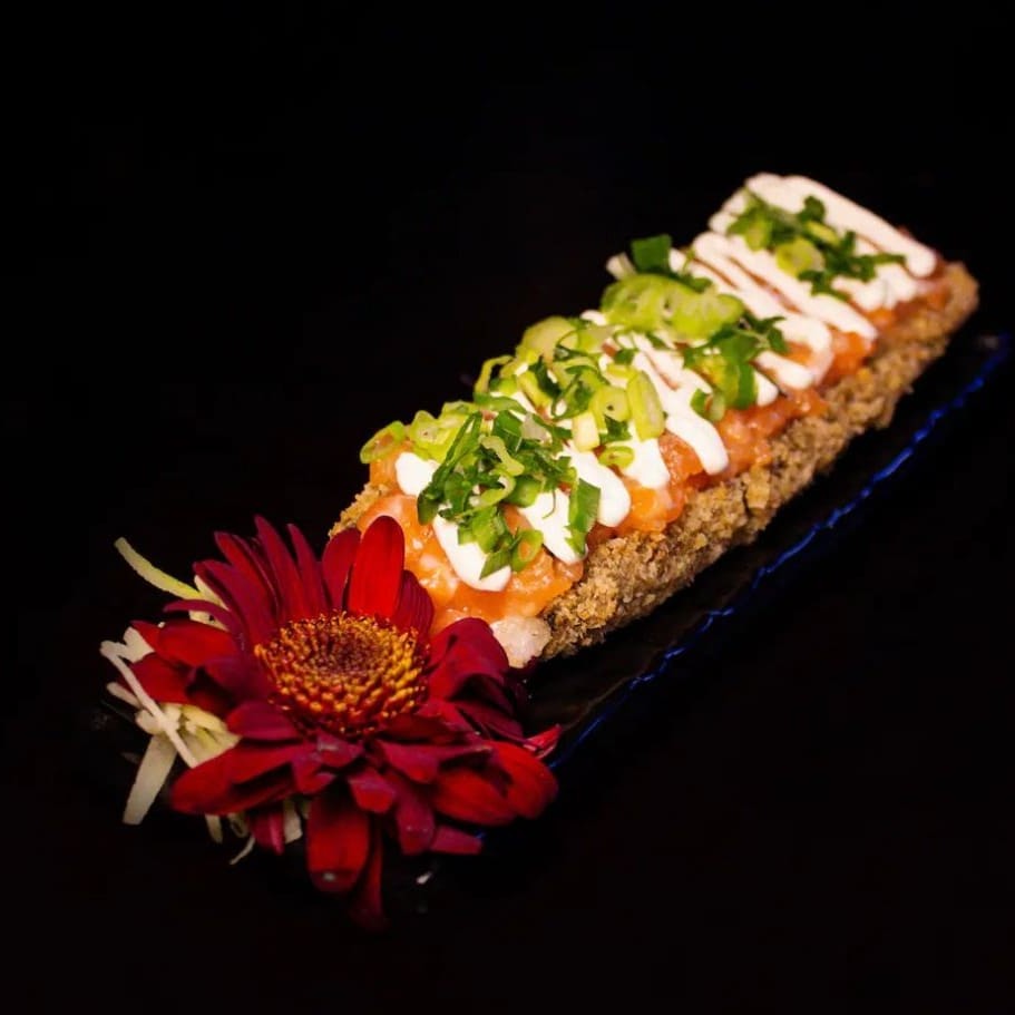 Delicioso Poke Com A Base De Arroz ,Salmão Cortados Em Cubos Empandos ,Couve Crispy ,Cebolinha E Creme Chisse