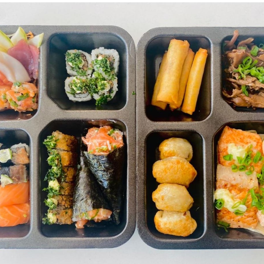 6 sashimi misto 4 jhous 4 uramaki skin 4 niguri 4 salmonmaki 6 hot roll 4 Mini temaki 1 porção shimeji 4 salmão grelhado 1 yakissoba 4 harumaki queijo 2 harumaki legumes 4 Guiozas. (sem alterações de itens) Acompanha 1 sachê tarê/ 1 sachê shoyo e 1 hashi. Caso queira á parte temos a opção de pedir.