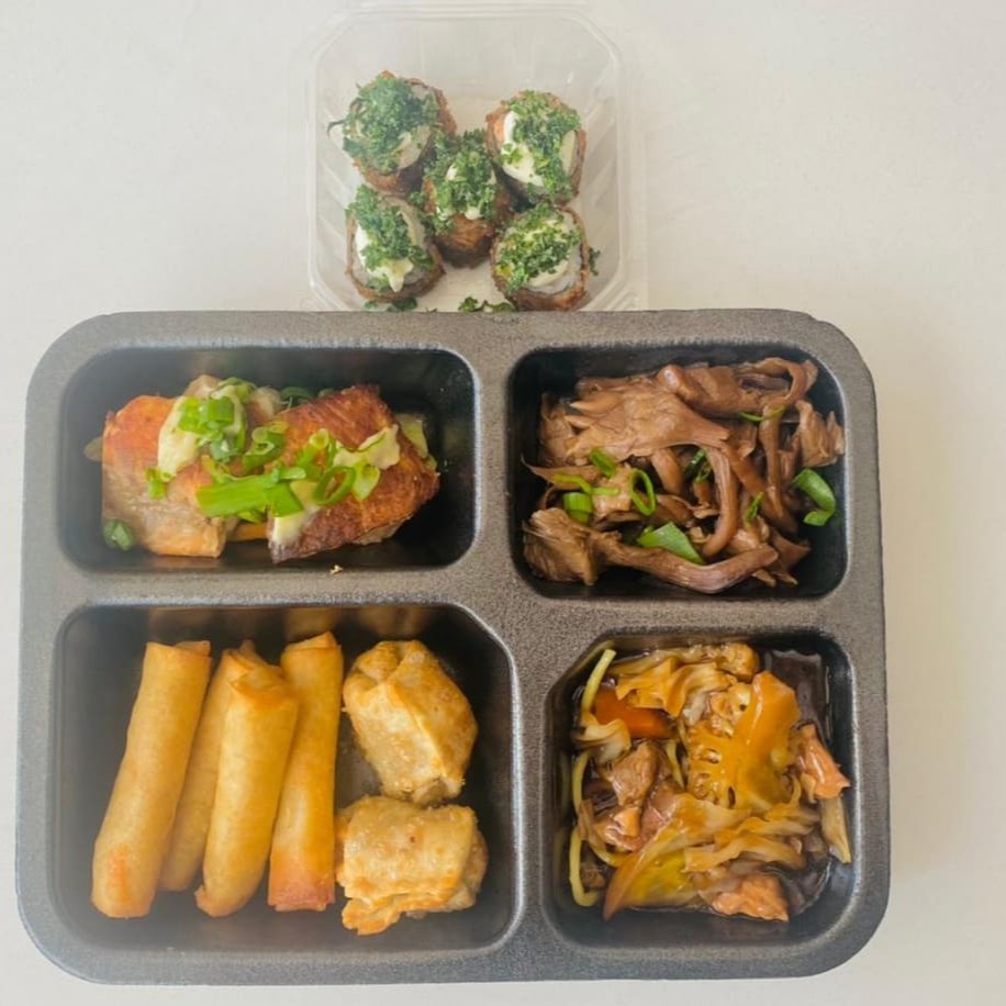 2 salmão grelhado com legumes 1 shimeji 200 grs. 1 yakissoba simples 200 grs. 2 Guiozas 4 harumaki queijo 5 hot holl Acompanha 1 sachê tarê/ 1 sachê shoyo e 1 hashi. Caso queira á parte temos a opção de pedir.