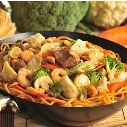 Macarrão Oriental, Carne Bovina, frango, camarão, lula, mista e vegetariana. Acompanhada De Legumes. Acompanha 1 sachê tarê/ 1 sachê shoyo e 1 hashi.
