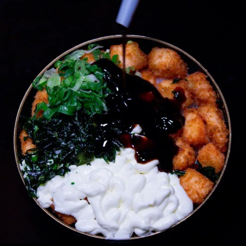 Delicioso Poke Mix Com Base De Arroz ,Salmão Batido ,Sunomono,Tomate Em Cubos Couve Crispy E Creme Chisse