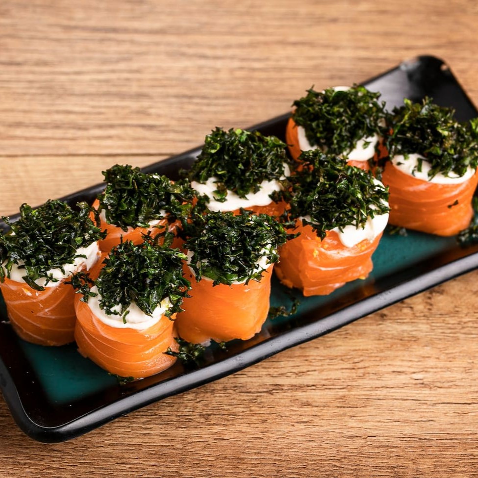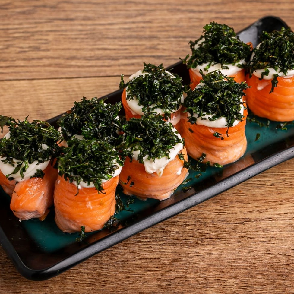 Salmão Skin, Arroz, Cream Cheese e Cebolinha .
