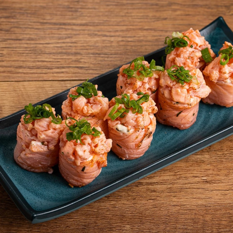 Hot empanado com recheio de cream cheese, cortado ao meio e coberto por salmão super fresco misturado no cream cheese e finalizado com molho taré, pimenta sweet chilli, celolinha e gergilim