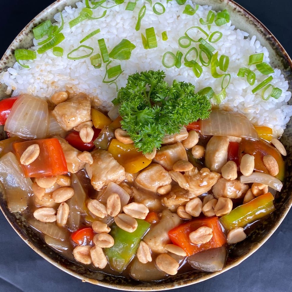 Peito de Frango em Cubos com cebola Pimentão e Amendoim, com molho a base de Shoyu.