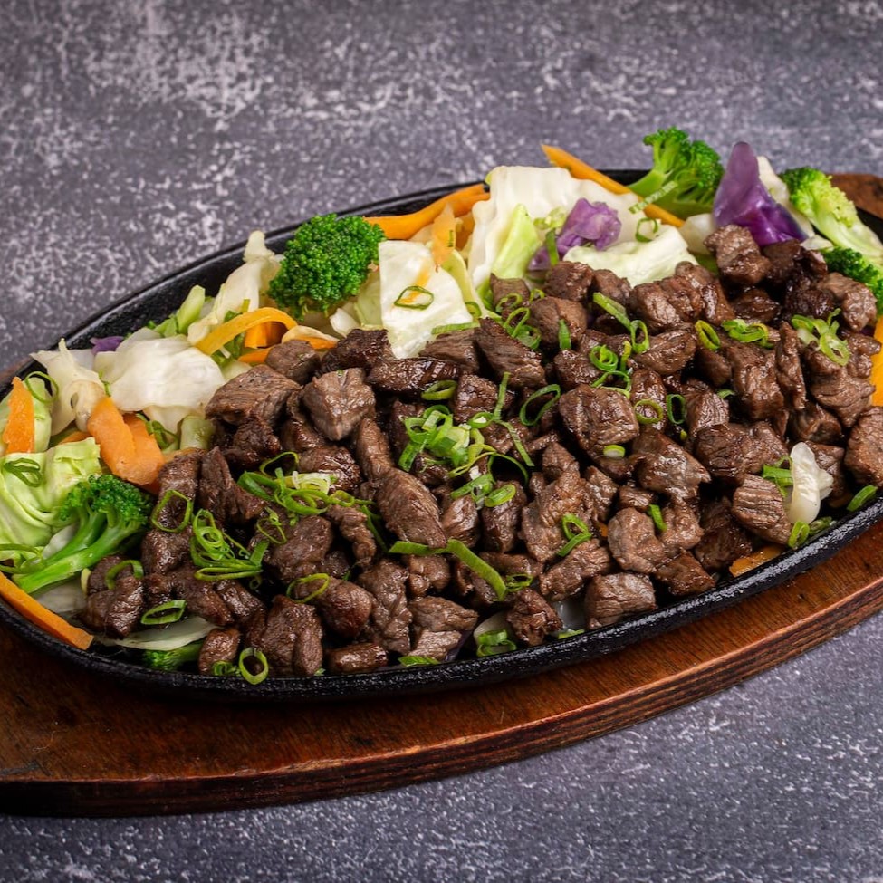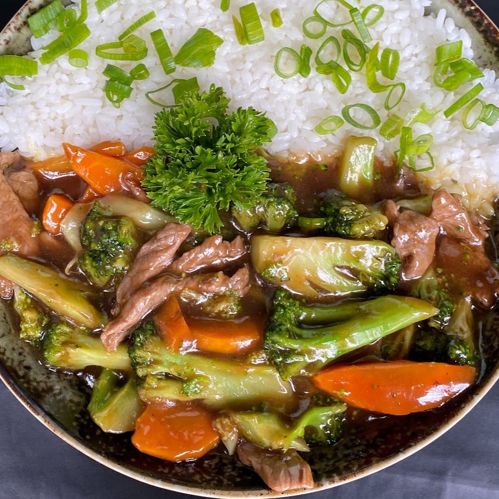 Carne ao molho especial do chef com legumes cenoura, brócolis, repolho e cebolinha, acompanha arroz japonês gohan.