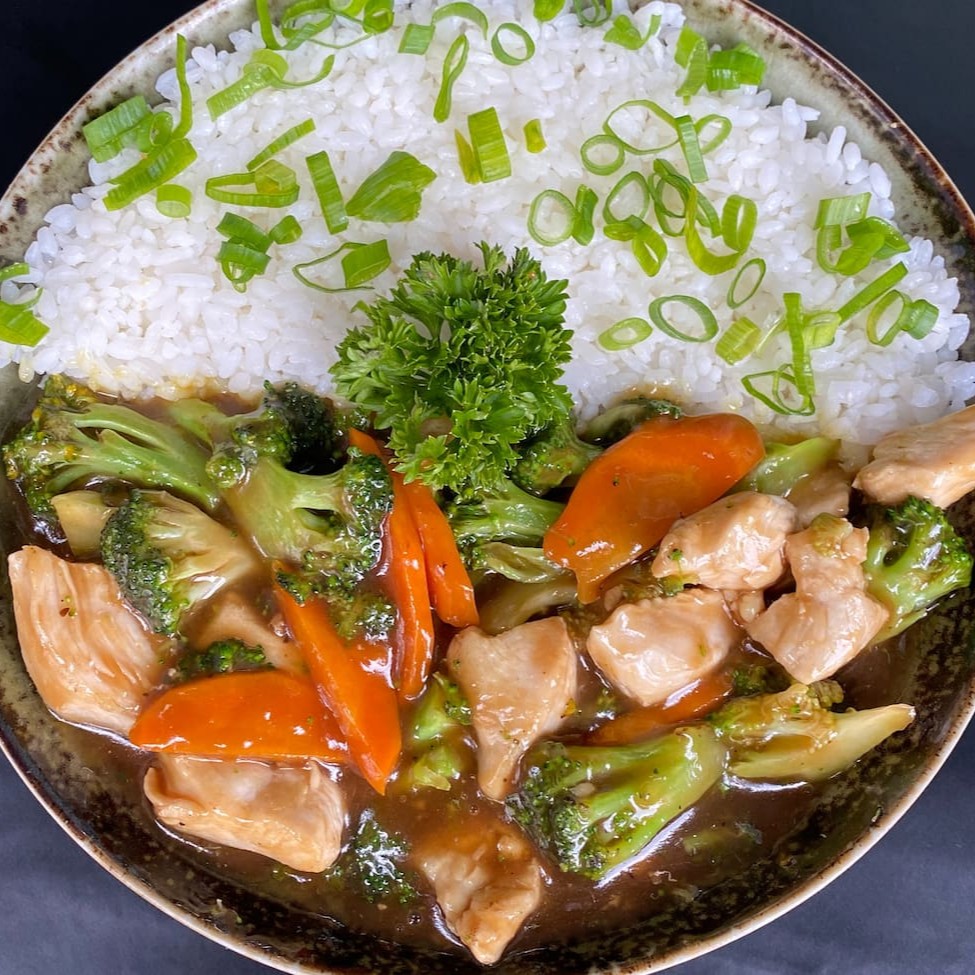 Frango ao Molho Especial com Cenoura, Brócolis, Acompanha Arroz Japonês Gohan.