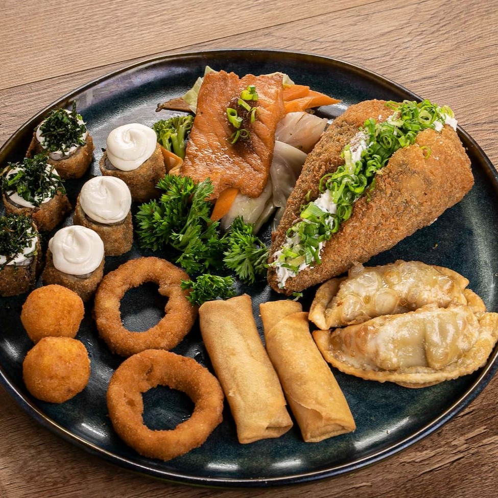 3 Hot rolls com Couve Crispe 3 Hot rolls com Cream Cheese 2 Anéis de cebola Empanada 2 Harumakis de Queijo 2 Guiozas 2 croquetes