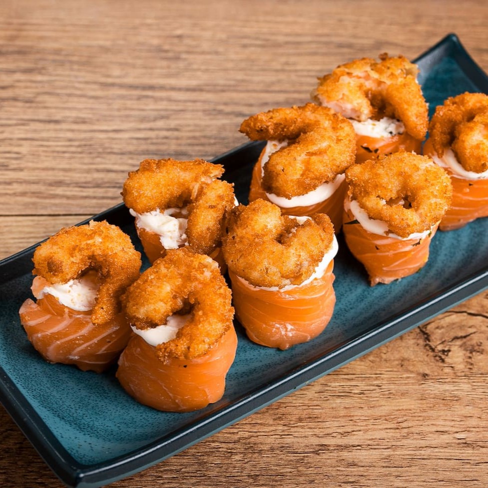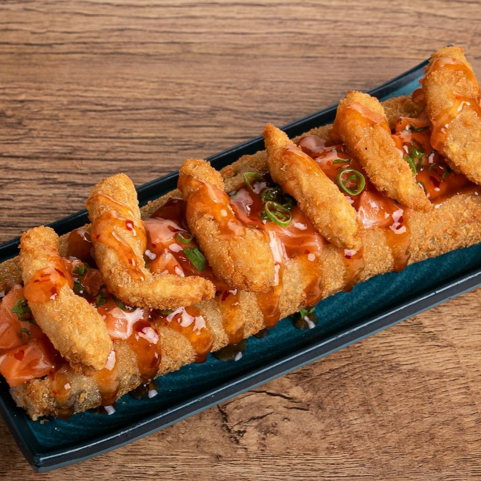 Hot empanado com recheio de cream cheese, cortado ao meio recheado de salmão super fresco misturado no cream cheese e por cima camarão empanado finalizado com molho tarê. Pimenta sweet chilli, celolinha e gergilim.