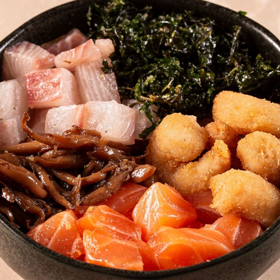 Arroz shari, salmão em cubos, shimeji, camarão empanado, tilápia e couve cryspe. Finalize como quiser!