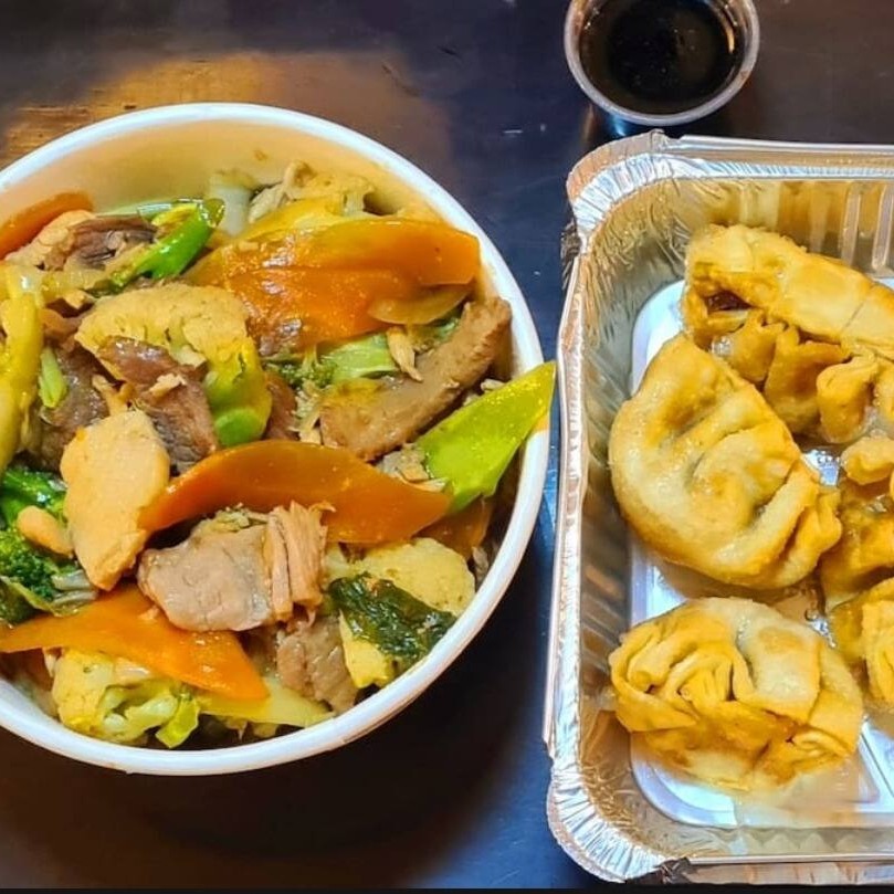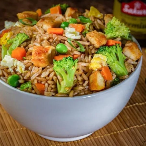 Yakimeshi é um prato tradicional japonês feito com gohan ( arroz japonês) temperado com legumes shimeji tudo picado na ponta da faca, shoyu óleo de gergelim, ovo e finalizado com cebolinha picada Na opção vegano não vai ovo