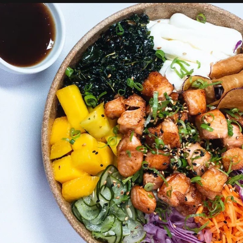 Nosso poke de salmão grelhado é uma delícia A base de arroz, salmão grelhado, manga, crispy de Couve, sunomono, crispy de batata doce, cebola roxa, gergelin, crem chesse, amêndoas laminadas ou amendoim e cebolinha