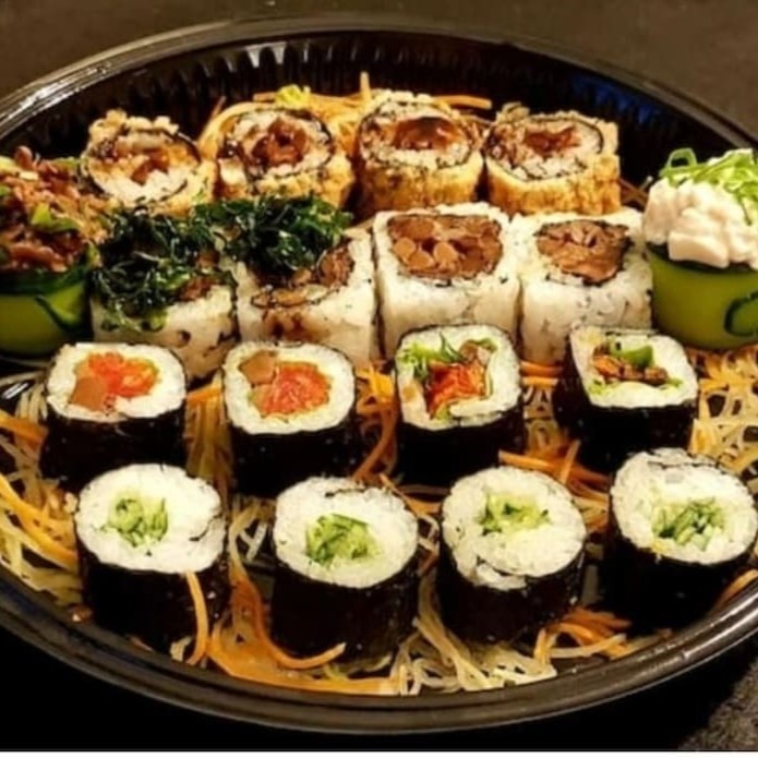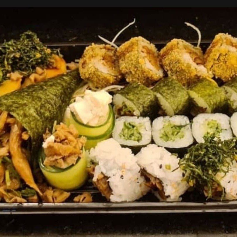 Combinado totalmente vegan vai 4 kappamaki 4 uramaki de shimeji 2 vai com crispy de cou vê 4 makisushi vegan (tomate seco, shimeji e rucula) 4 Hot holls de shimeji 2 jou de Pepino recheado com tofu ou shimeji 1 temaki a sua escolha