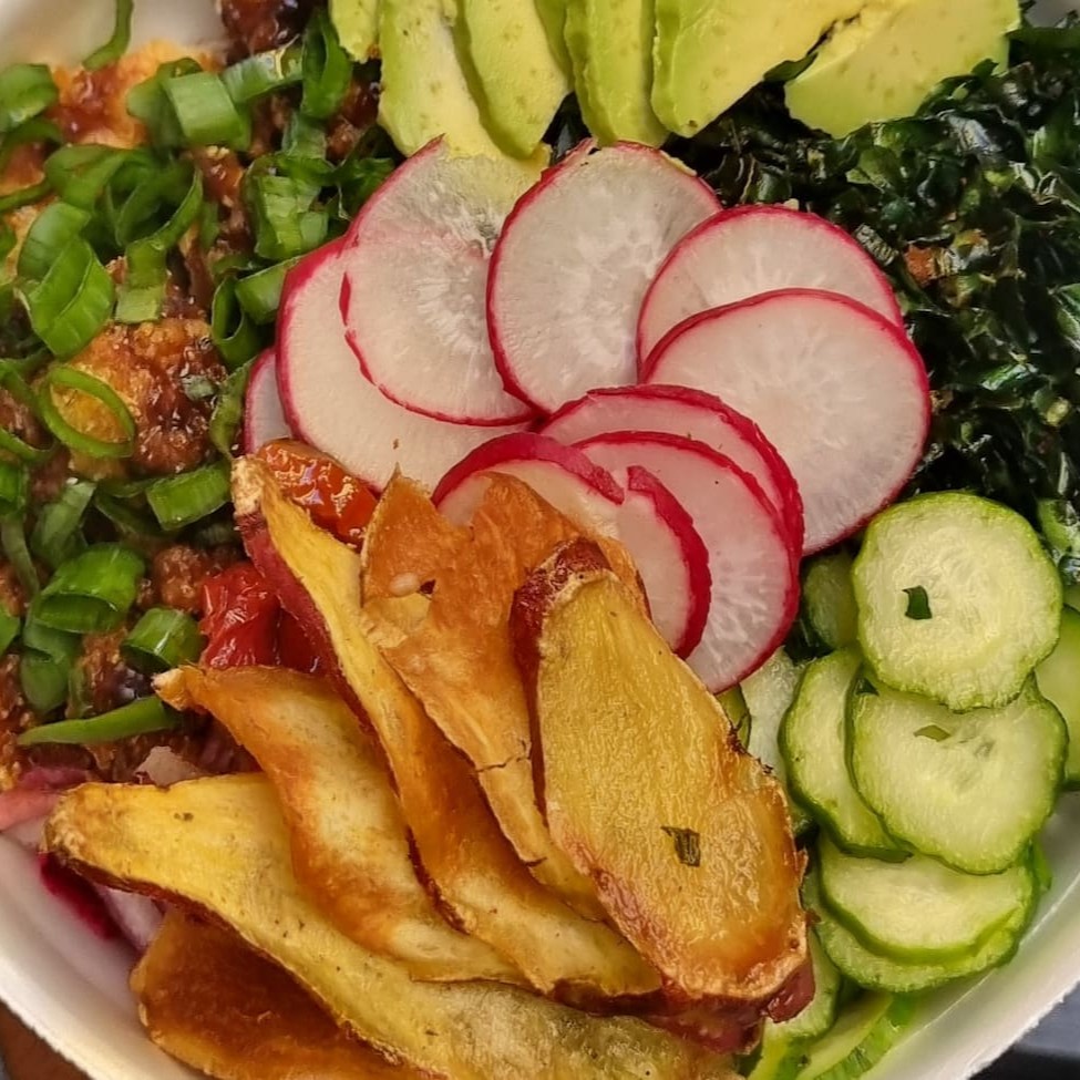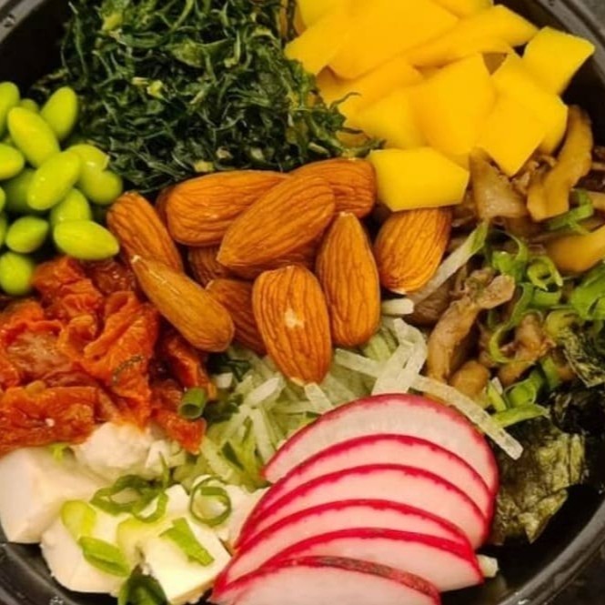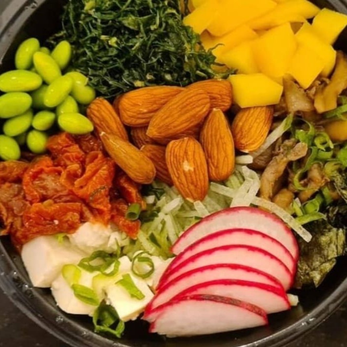 """Descubra uma Explosão de Sabores no Nosso Poke Vegetariano! Este prato é uma mistura exótica de ingredientes frescos e deliciosos: shimeji perfeitamente salteado, pepino crocante, manga suculenta, crispy de couve para uma textura extra, rabanete refrescante, amendoim crocante e tomate fresco. Tudo é harmoniosamente combinado... A base é de arroz"