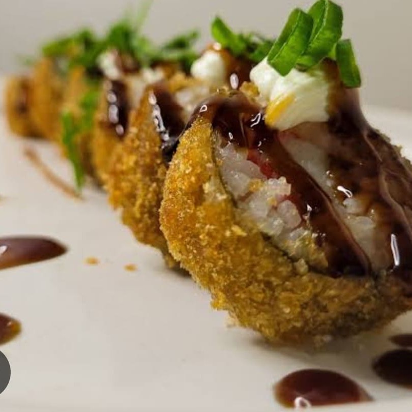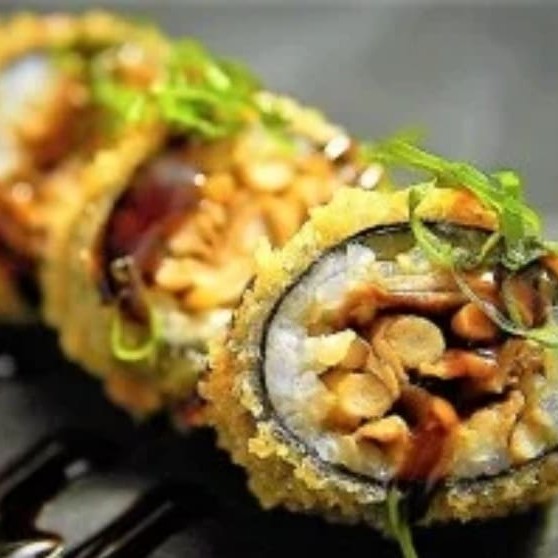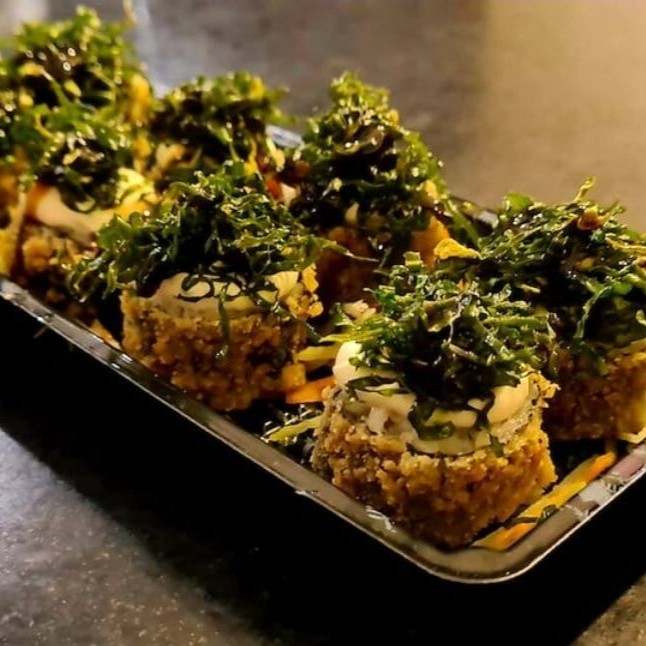 Couve flor empanado, molho tarê, pepino, cryspi de couve, manga, amendoim, nori, gergelim torrado, se for vegetariano vai cream chesse se for vegano não vai