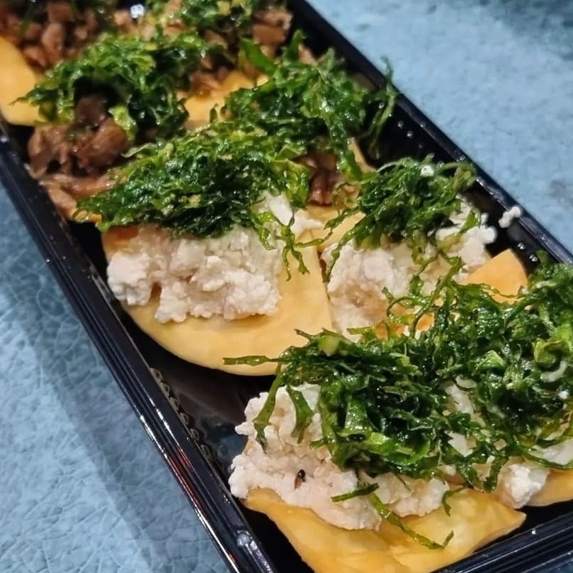 8 unidades de casquinha crocantes e sequinhas recheadas de tofu, crispy de couve e molho tarê