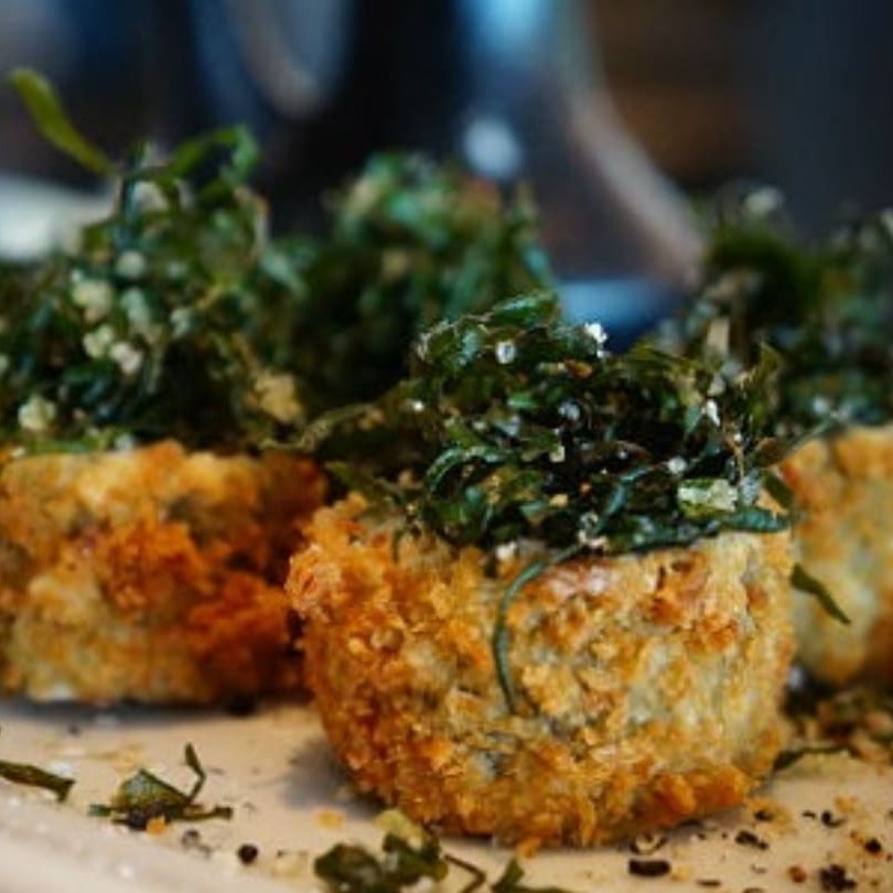 4 casquinha crocantes recheadas de tofu e shimeji com crispy de couve e molho tarê