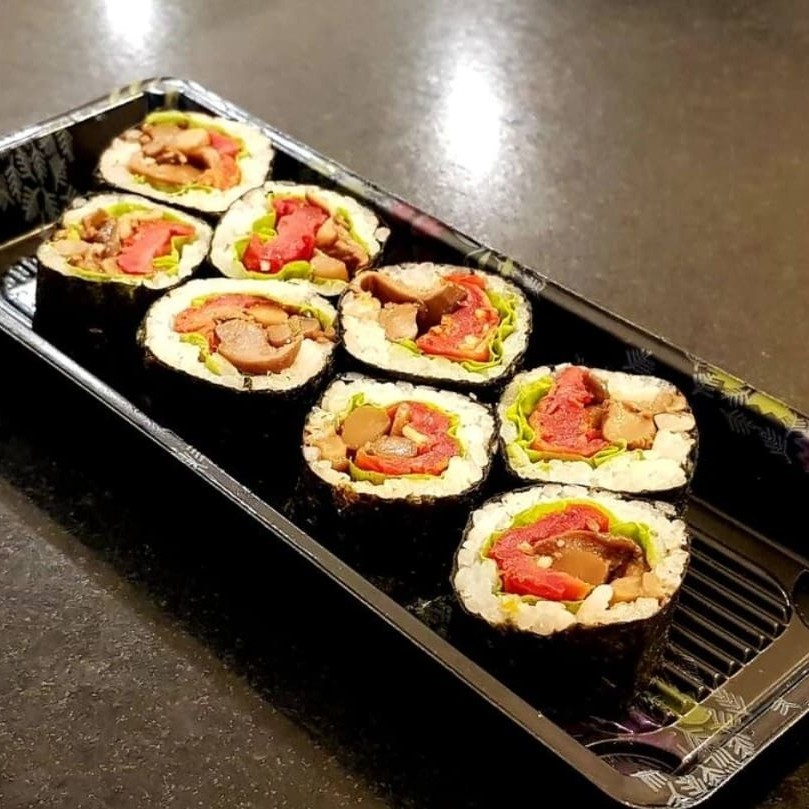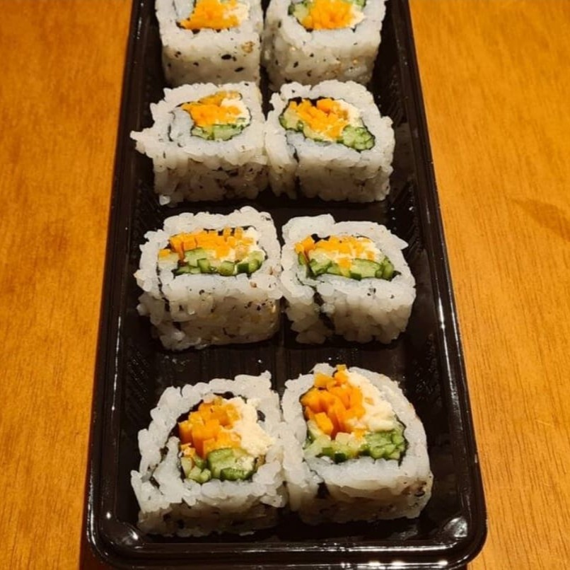 Um combinado que vai matar sua fome e com preço pequeno 4 kappamaki 4 makisushi vegan (enrolado recheado com tomate seco shimeji e rucula) 4 uramaki de shimeji 2 vai com crispy de couve Sushi vegano