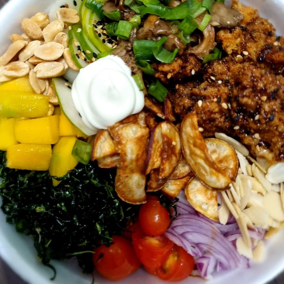 Poke de frango teriake é o frango bem suculento, empanado e frito, pepino, manga, crispy de couve, nori, rabanete, shimeji e molho tarê Peça já o seu