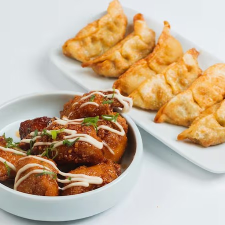Combo com 3 unidades de guioza (pastel oriental frito recheado de carne bovina com legumes). Peito de frango marinado por 12 horas em temperos orientais, empanado em uma farinha especial Dakorea e frito até alcançar uma crocância irresistível.