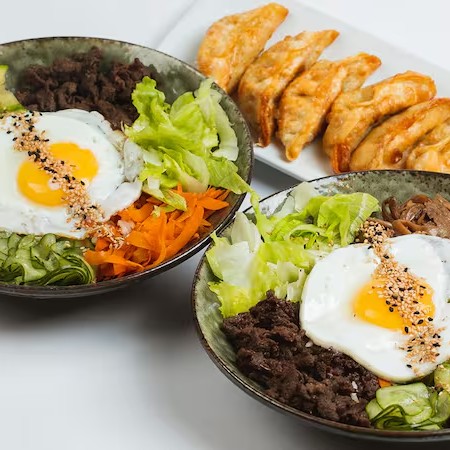 2 Poke Koreanos (bibimbap) + 6un Guioza Carne Com Legumes