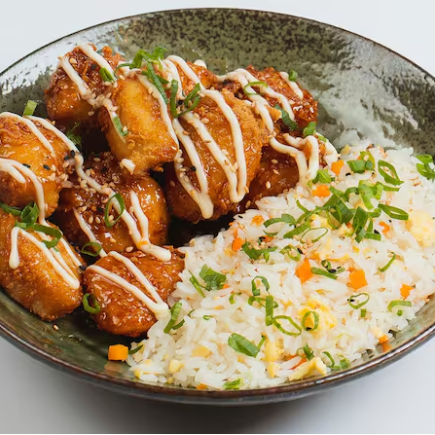 Suculentos pedaços de peito de frango marinados por 12 horas em um molho agridoce oriental levemente apimentado, empanados e fritos até ficarem crocantes. Finalizados com maionese artesanal da casa, gergelim torrado e cebolinha fresca. Acompanhamento: Escolha 1 opção de acompanhamento. Caso não haja seleção, será enviado com Fried Rice (arroz temperado com cenoura, ovo e cebolinha).