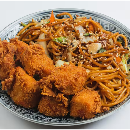 Peito de frango marinado por 12 horas em temperos orientais, empanado em uma farinha especial Dakorea e frito até alcançar uma crocância irresistível. Acompanha macarrão oriental salteado com legumes frescos (cenoura, repolho e cebolinha) ao molho à base de shoyu, resultando em um acompanhamento com muito Umami saboroso e equilibrado. # macarrão # panda # comida oriental