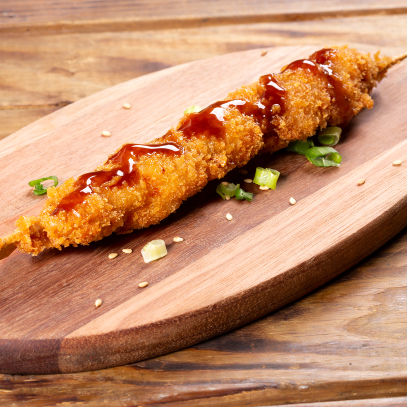 Salsicha Viena Empanada em Farinha Panko Especial, com Finalizados de Molho Tonkatsu.