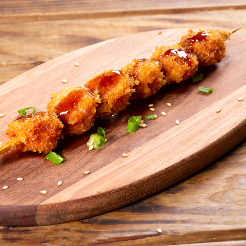 Sobrecoxa Empanada em Farinha Panko Especial. Crocante e Suculento. Finalizados com Molho Tonkatsu.