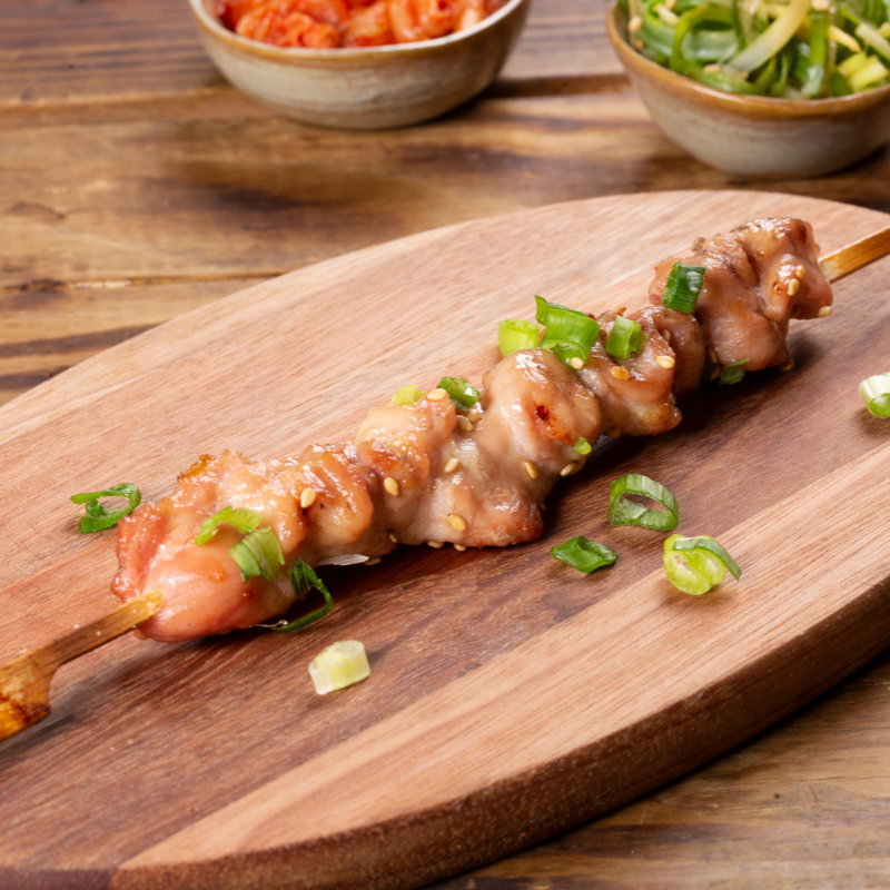 Pedaços de Sobrecoxa Assados na Brasa, Temperada em Nosso Molho Apimentado à base de Kochujang, pasta de pimenta coreana. Picante.