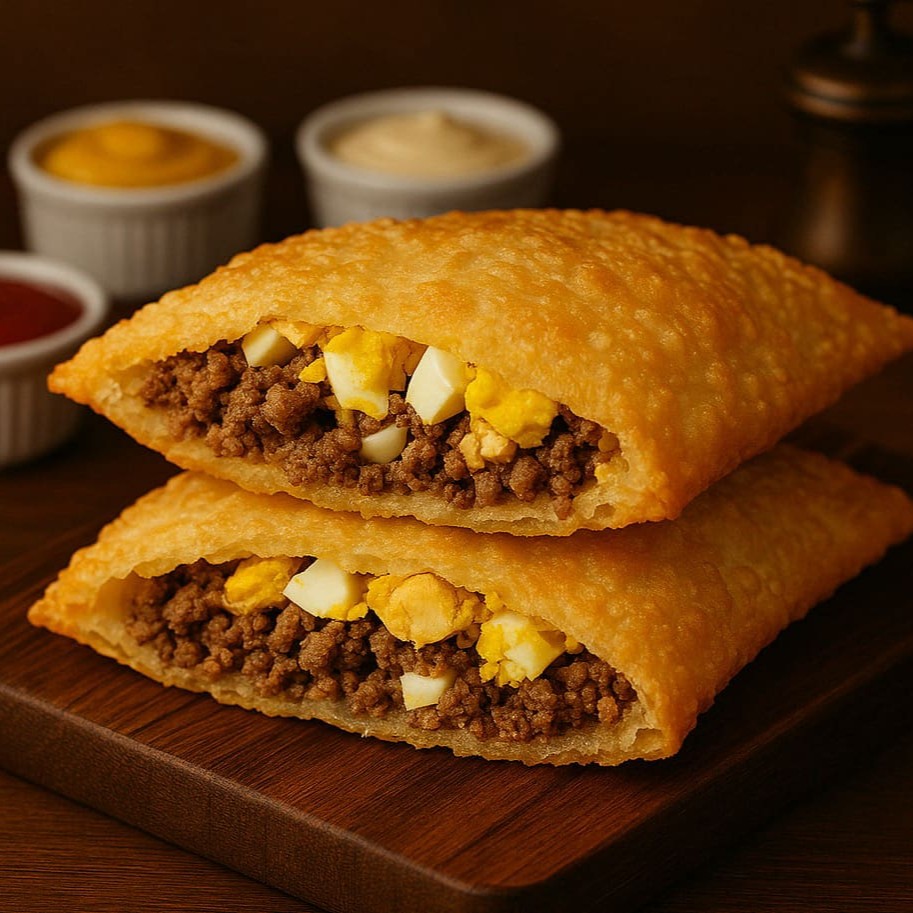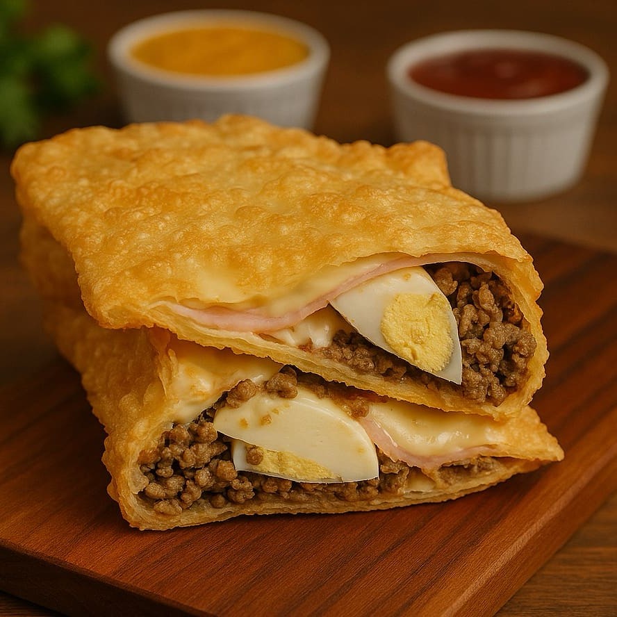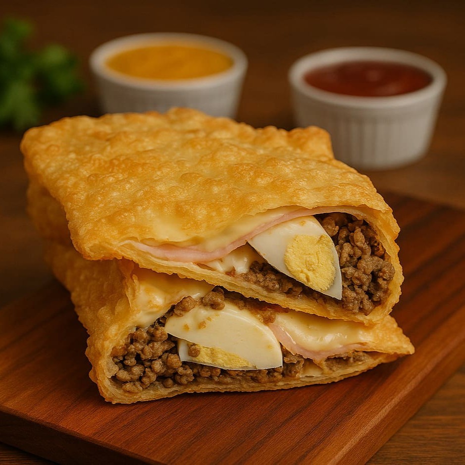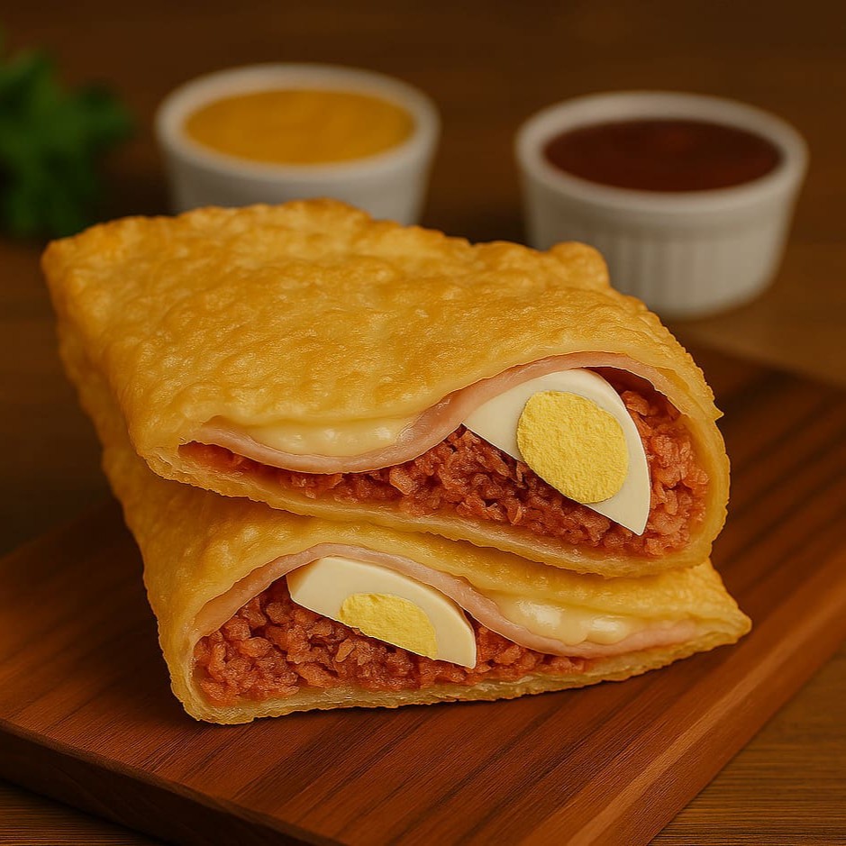 """Pastel especial de carne: recheado com carne bem temperada, ovo, presunto, queijo, tomate e azeitona, tudo envolto em uma casquinha crocante e dourada… uma explosão de sabor a cada mordida! """