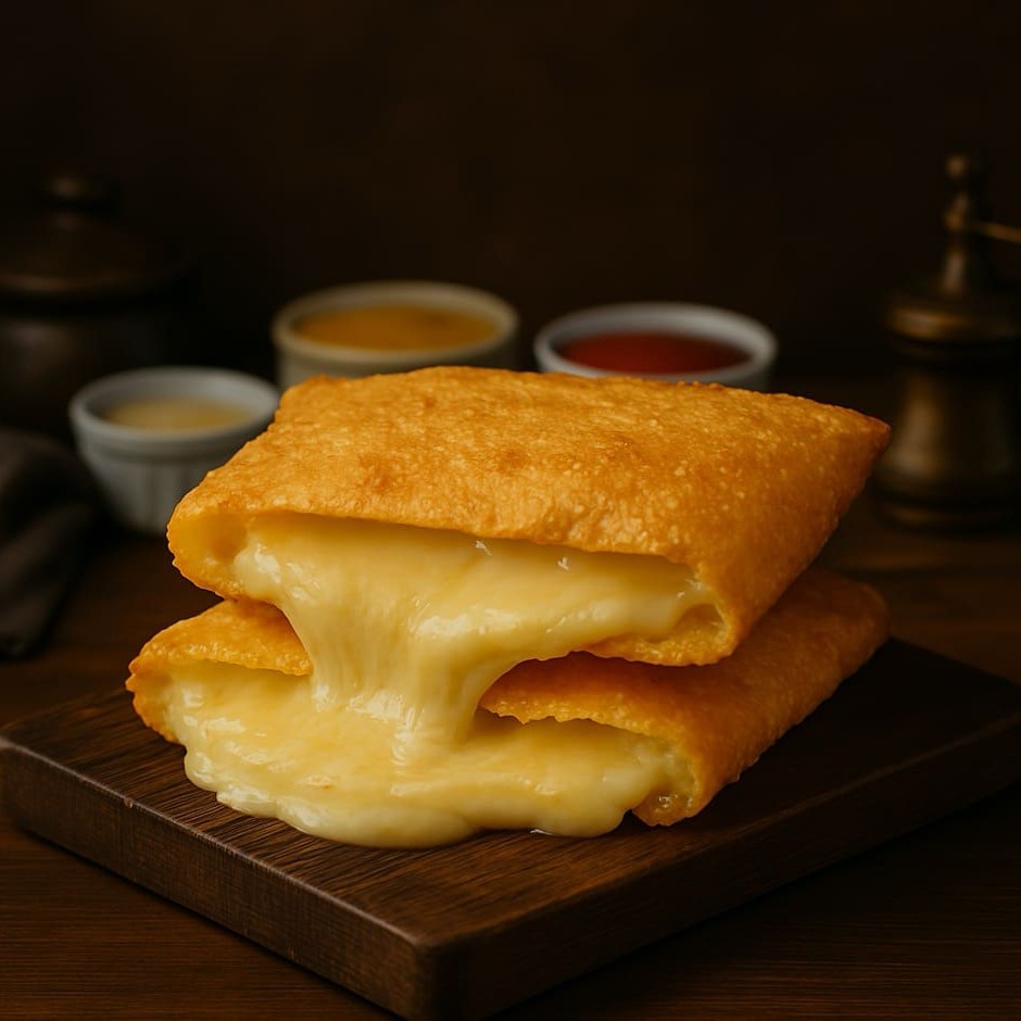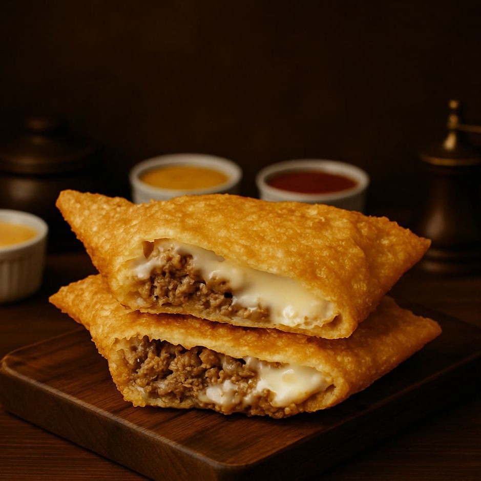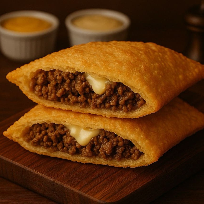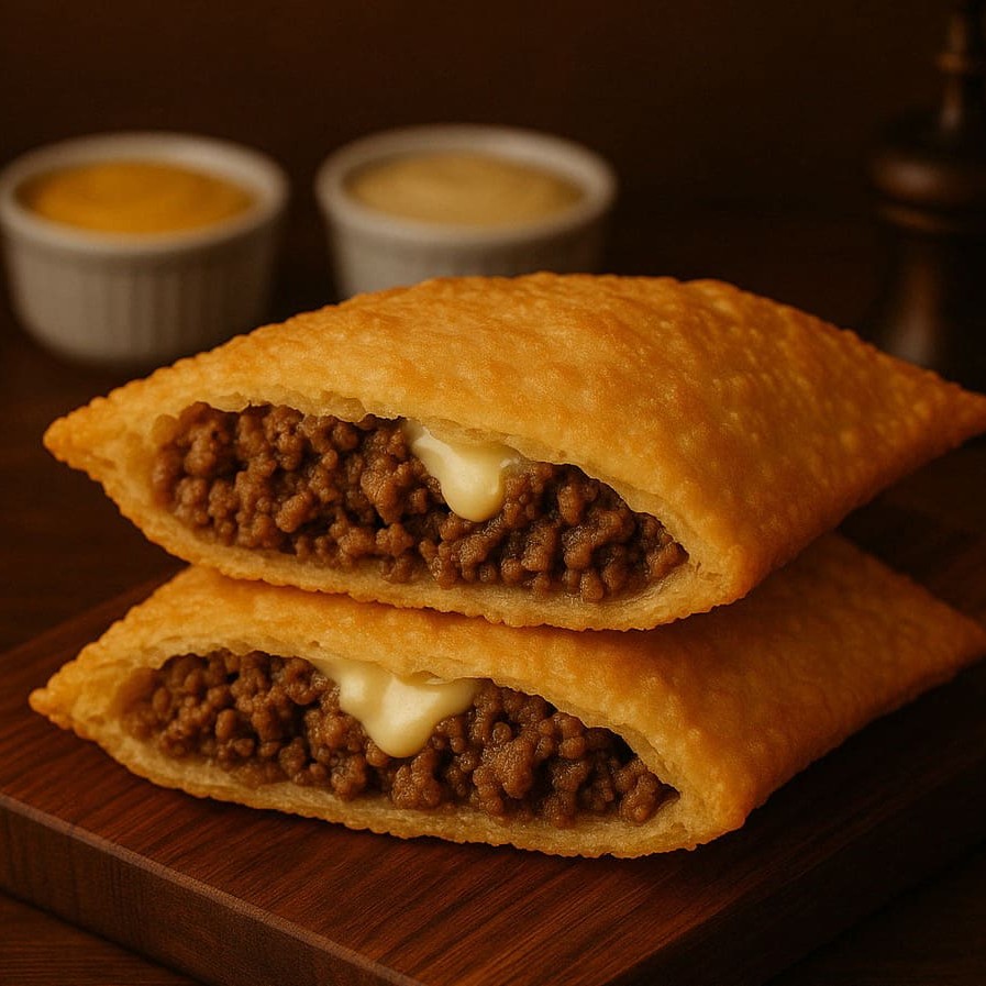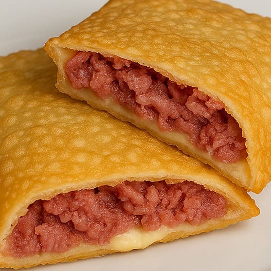 """Pastel de carne com queijo: carne suculenta e bem temperada, combinada com queijo derretido, tudo dentro de uma casquinha crocante e dourada… uma delícia em cada mordida! """