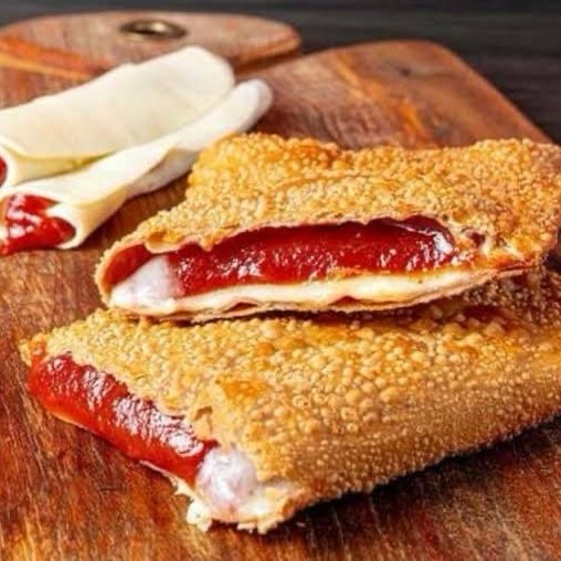"""Pastel de pizza: queijo derretido, tomate suculento e um toque de orégano, tudo dentro de uma casquinha crocante e dourada… o sabor da pizza em um pastel irresistível! """