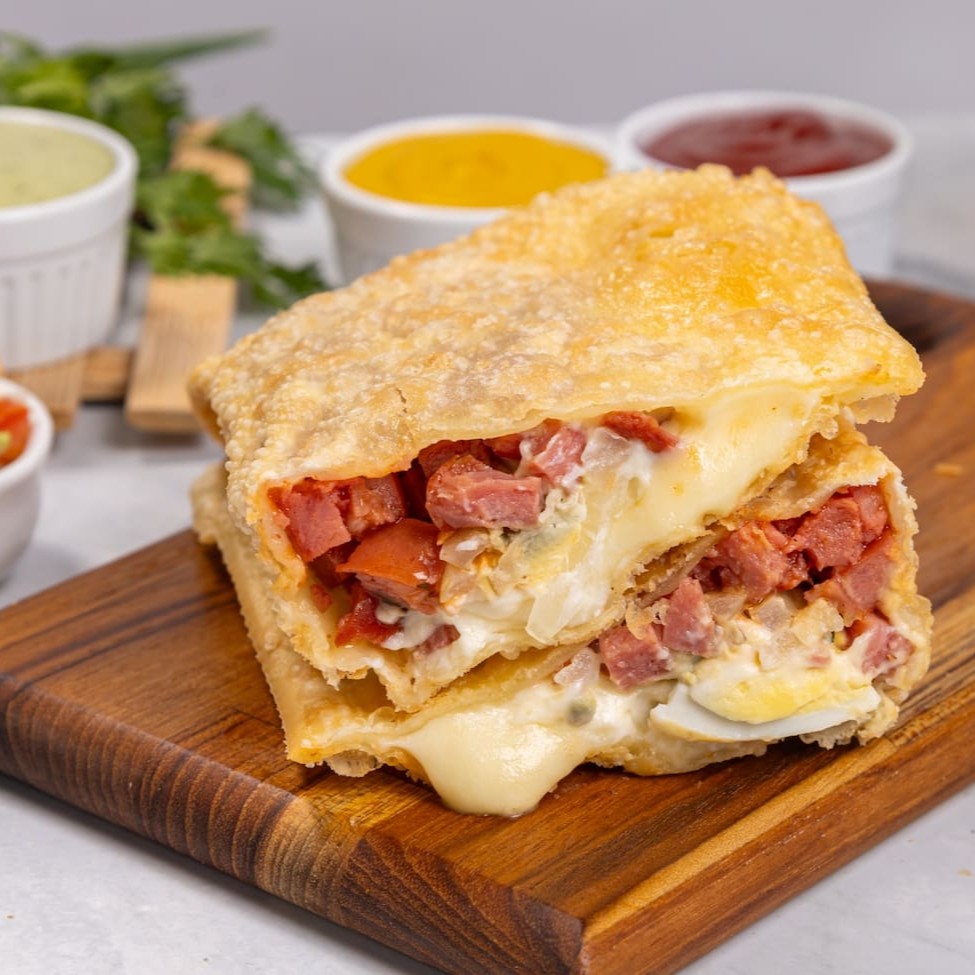 """Pastel especial de calabresa: calabresa bem temperada, combinada com ovo, presunto, queijo, tomate e azeitona, tudo dentro de uma casquinha crocante e dourada… um sabor irresistível em cada mordida! """