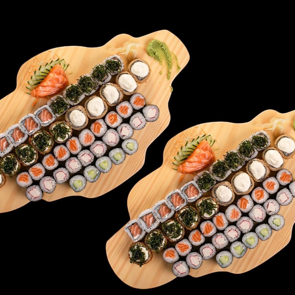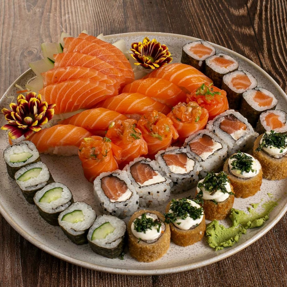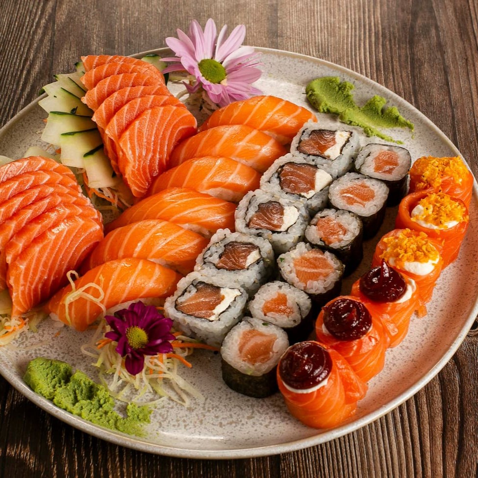 12 sashimi de salmão 6 niguiri de salmão 3 djou goiaba 3 djou doritus 5 uramaki de salmão 6 Hossomaki sem alterações nos itens ;