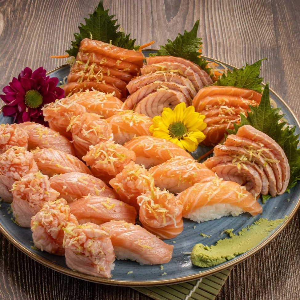 10 sashimi de salmão trufado com raspa limão siciliano, azeite trufado e flor de sal 10 sashimi de salmão flambado e trufado com flor de salmão ,limão siciliano e azeite trufado 5 niguiri de salmão trufado e flambado 5 niguiri de salmão trufado 5 djou de salmão trufado 5 djou de salmão flambado e trufado sem alterações nos itens .