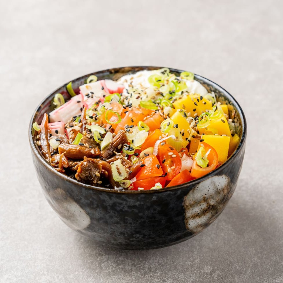 Arroz xari , salmão em cubos ,manga , tomate ,shimeji ,kani e creme cheese ,finalizado com gergelim.