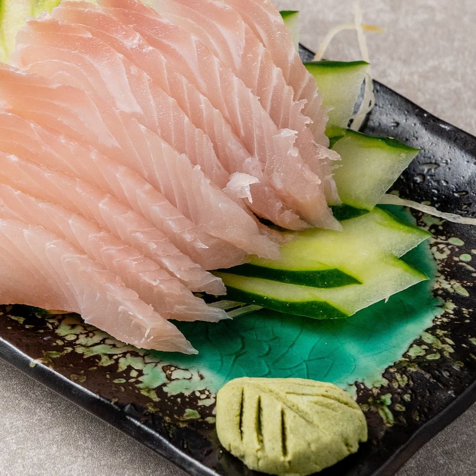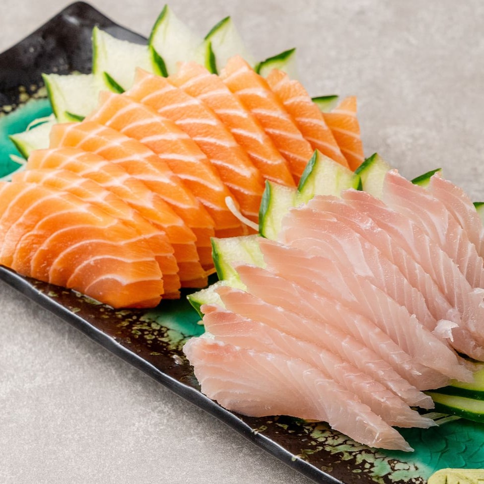Finas fatias de sashimi de tilapia e salmão.