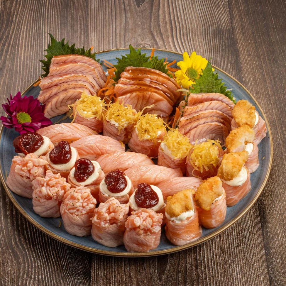 15 sashimi de salmão flambado 5 djou flambado com batata 5 djou de salmão flambado com goiabada 5 niguiri de salmão flambado 5 djou de salmão flambado 5 djou flambado com lula empanado sem alterações nos itens;