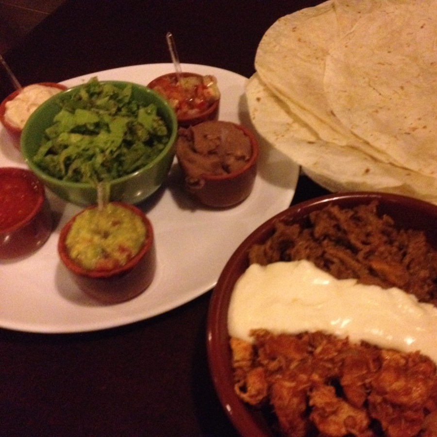 Quatro tortillas de trigo, uma porção de carne em tiras, uma porção de frango em tiras, queijo derretido e alface. Acompanham: guacamole, sour cream e pasta de feijão (100 ml de cada molho). *Obs: Todos os molhos vão separados.