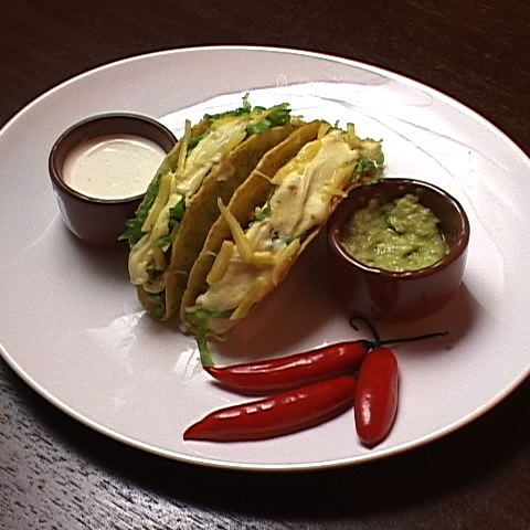 Duas tortillas de milho crocantes recheada com frango, alface, tomate e queijo. Acompanham guacamole e sour cream.