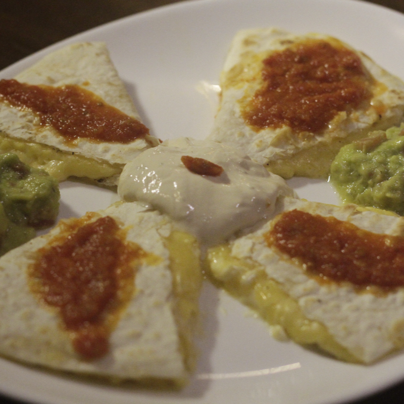 Tortilla de trigo recheada com queijo ou "queijo e mais um recheio a sua escolha" com um toque de salsa mexicana por cima. Acompanham: guacamole e sour cream (50ml de cada molho). *Obs: Todos os molhos vão separados.
